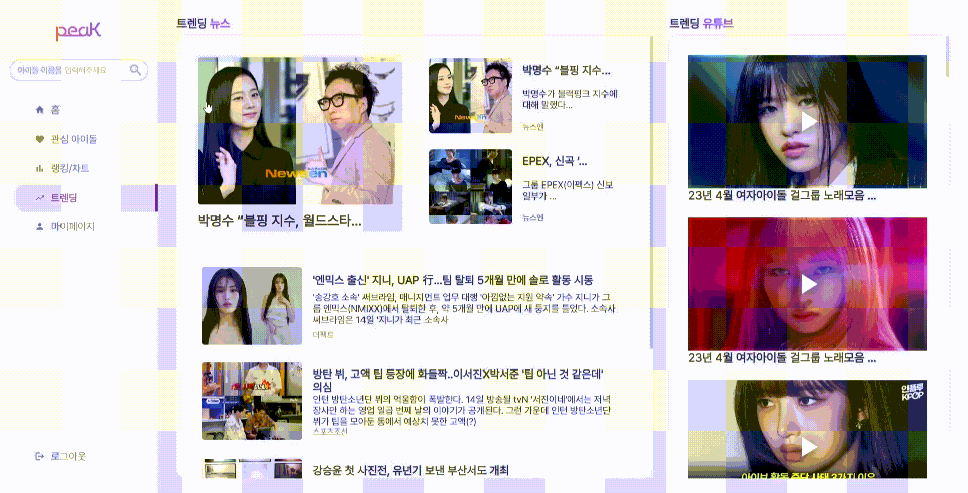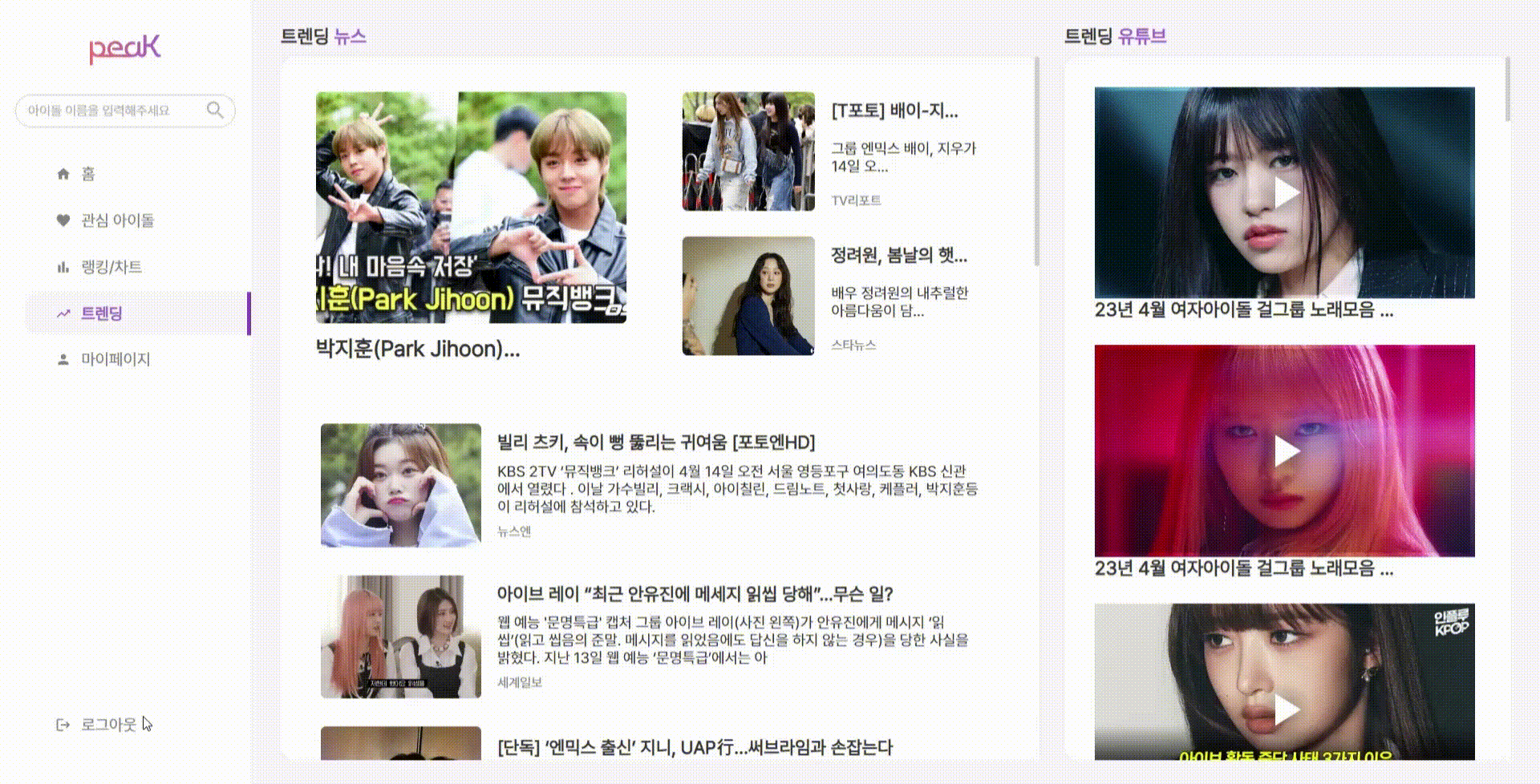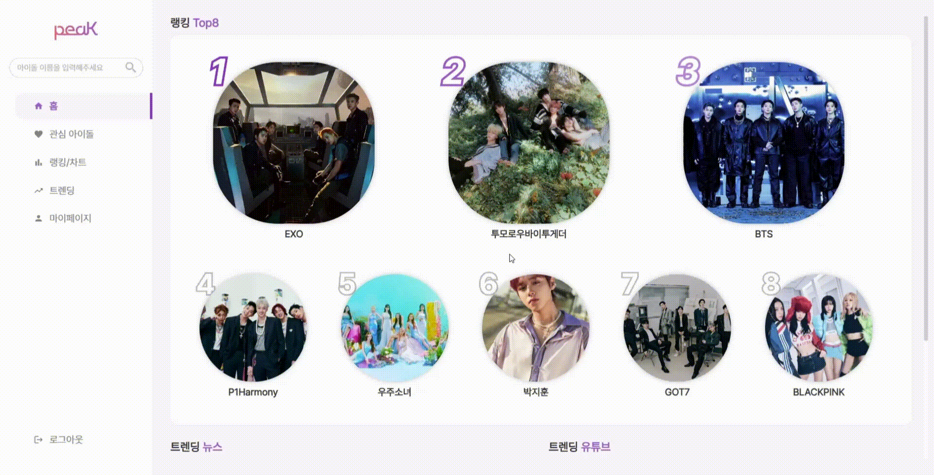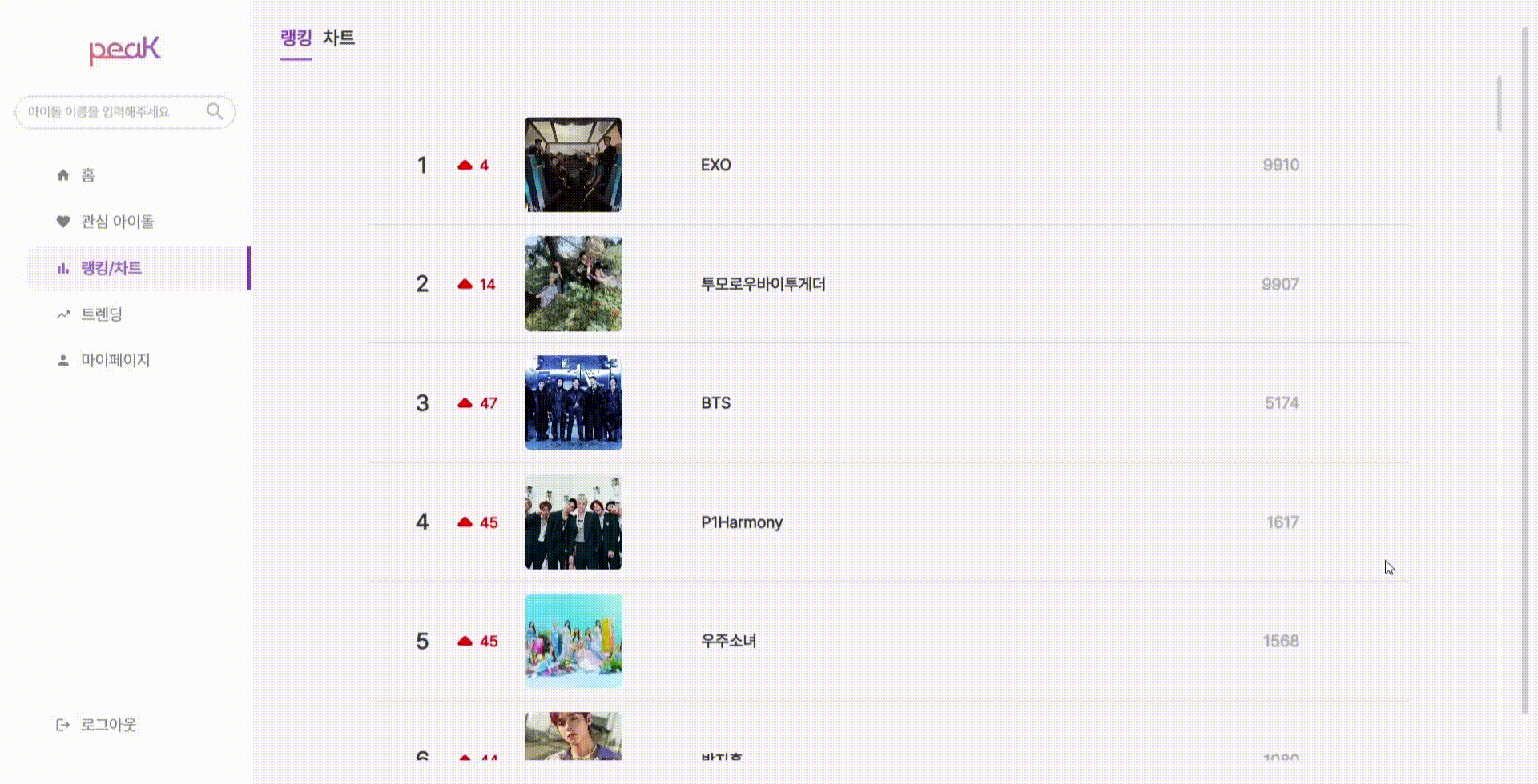 아이돌에 대한 peaK만의 랭킹과 차트를 확인해보세요