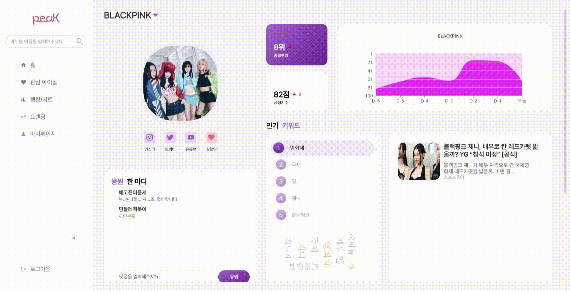 내가 좋아하는 아이돌의 핫 키워드 및 인기 뉴스 기사 확인