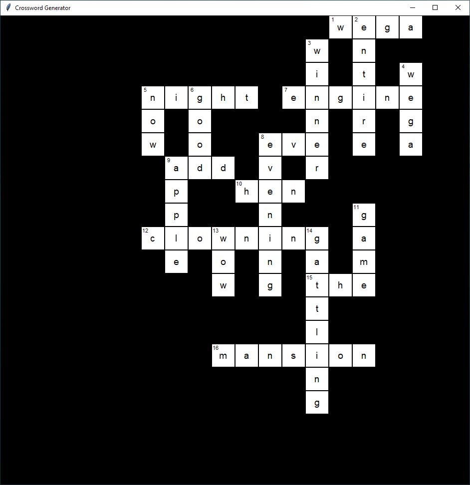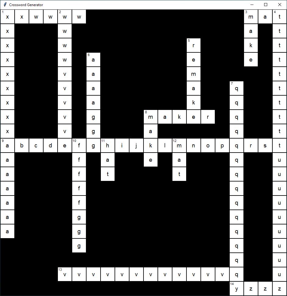 Description: This app creates a valid crossword puzzle out of as many words as possible that the user enters through a command line and graphically displays it. The app can also give reasons to each word that could not fit into the board.