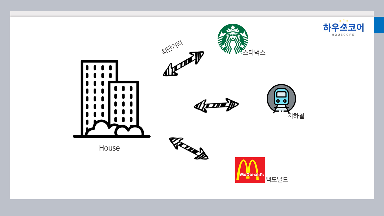μ μλ νμ¬ μννΈκ° μλ ꡬμ λμ κΈ°μ€μΌλ‘ κ³μ°λ©λλ€. ꡬμ λμ μ΅λ¨κ±°λ¦¬, νκ· κ±°λ¦¬, μ΅μ₯거리λ₯Ό κ°μ Έμ μννΈμ κ°μ₯ κ°κΉμ΄ μ§νμ² μ, μ€νλ² μ€, λ§₯λλ λ 거리λ₯Ό λΉκ΅ν΄ νκ· μ λ΄μ μ μλ₯Ό λμ΅λλ€.