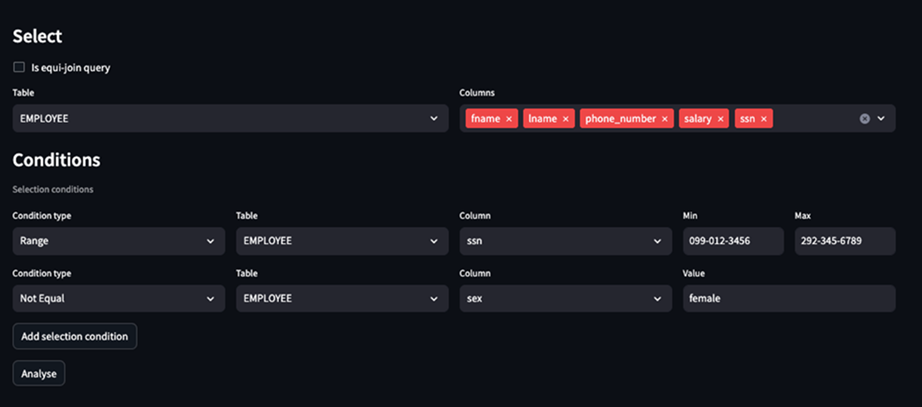 - It accepts queries involving SELECT or JOIN operations. For SELECT operation, we focused on selection using a primary key and equality operator, selection using a primary key with range operator, selection on a non-primary key using equality operator, and selection on a non-primary key with range operator. For JOIN operation, we considered only equi-join operation.