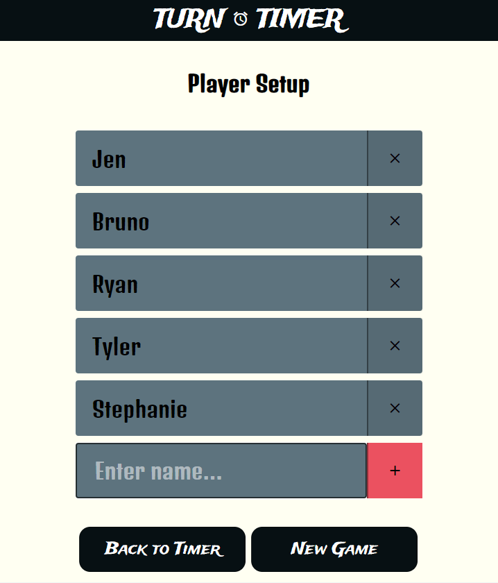 A simple web application for timing turns during board games. Our group found ourselves wanting to speed up our gameplay while playing Oath (incredible game, but so much analysis paralysis), so we started timing our turns. After this became a regular thing, I searched around for a timer app that fit our needs, but surprisingly couldn't find anything. All the timer apps I found either required a download, were ugly, complicated, noisy, or were made for Chess. So, I decided to make my own.