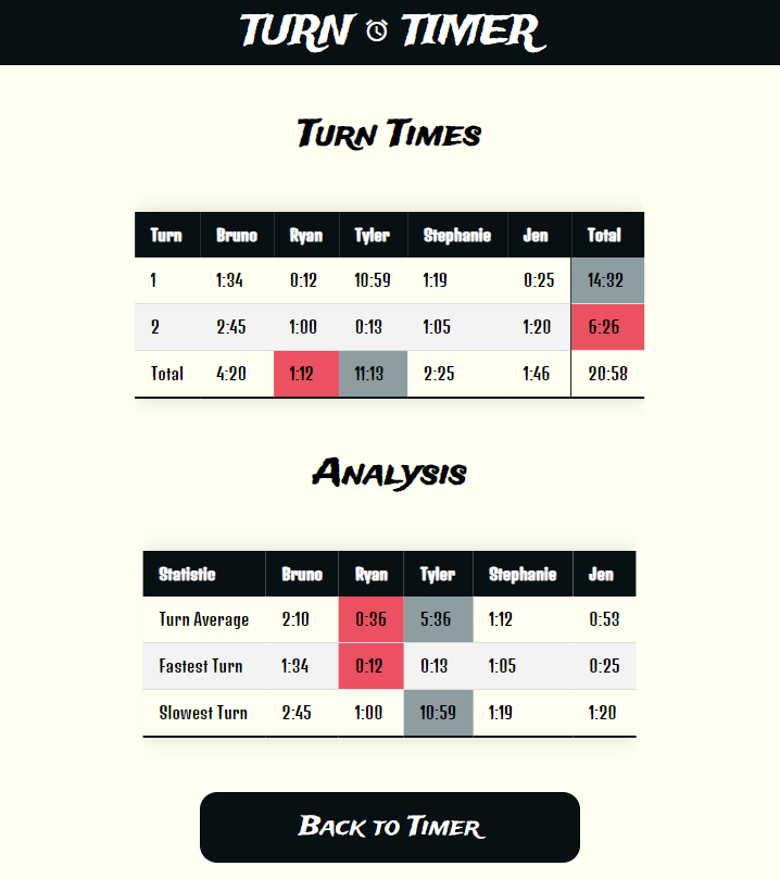 This app doesn't require a download or login, and is usable right from the browser. Just plug in your players' names and start. It will track turns and provide stats like average turn length, shortest turn, and longest turn per player. It works equally well for fixed-turn-order games as for those with a flexible turn order. This is a purely a "count up" timer, and does not have turn time limits or alarms. The goal was to be simple and unobtrusive. This is meant to be run from a single device, likely one player's phone or tablet, although it looks good on a wide variety of screen sizes.