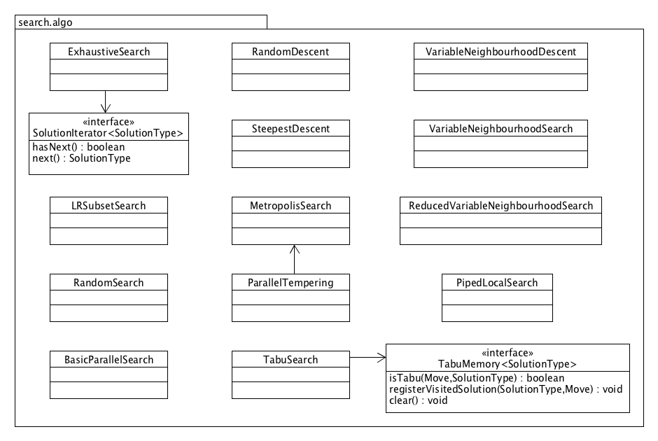 The class of neighbourhood searches is further subdivided into two types: SingleNeighbourhoodSearch and MultiNeighbourhoodSearch. The former provides an abstraction of neighbourhood searches with a single neighbourhood, e.g. random descent, steepest descent or Metropolis search, while the latter represents a neighbourhood search with multiple neighbourhoods, such as variable neighbourhood descent or variable neighbourhood search.