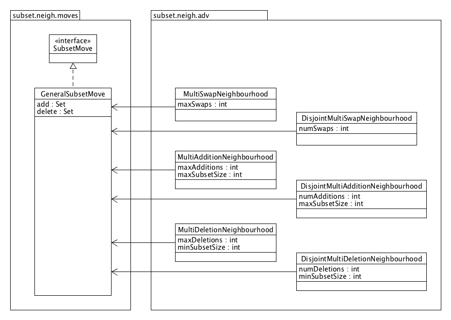 Similarly, four unidirectional neighbourhoods are provided which generate moves that perform a fixed or variable number of additions ([Disjoint]MultiAdditionNeighbourhood) or deletions ([Disjoint]MultiDeletionNeighbourhood). These may for example serve as shaking neighbourhoods in a variable neighbourhood search.