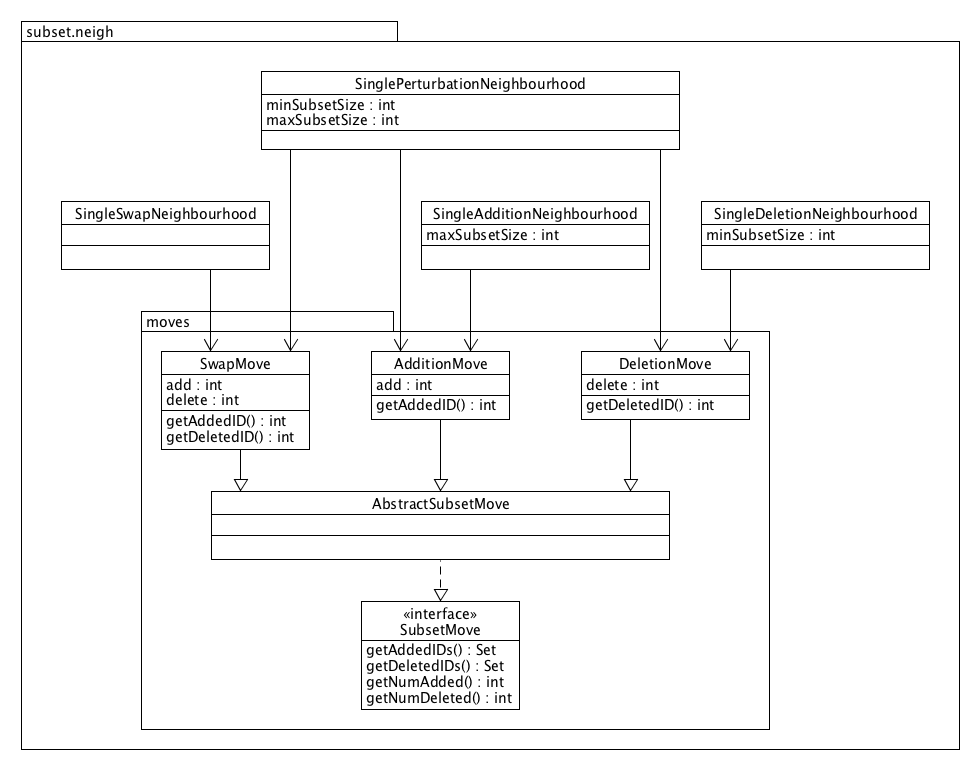 Of course, it is not always possible (or desired) to use one of the available subset neighbourhoods for a specific subset selection problem. In such case, a custom neighbourhood can be provided by implementing the Neighbourhood interface with solution type SubsetSolution. Given a subset solution, this custom neighbourhood may generate any AdditionMove, DeletionMove, SwapMove or GeneralSubsetMove to modify the solution.