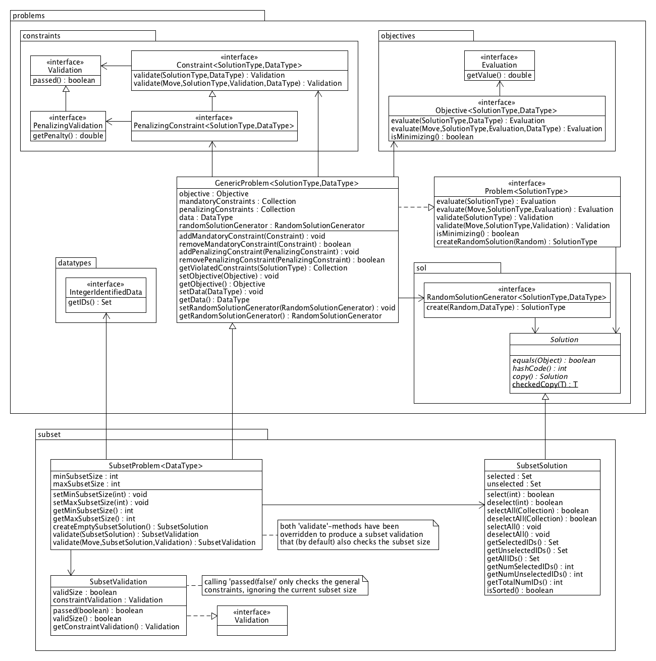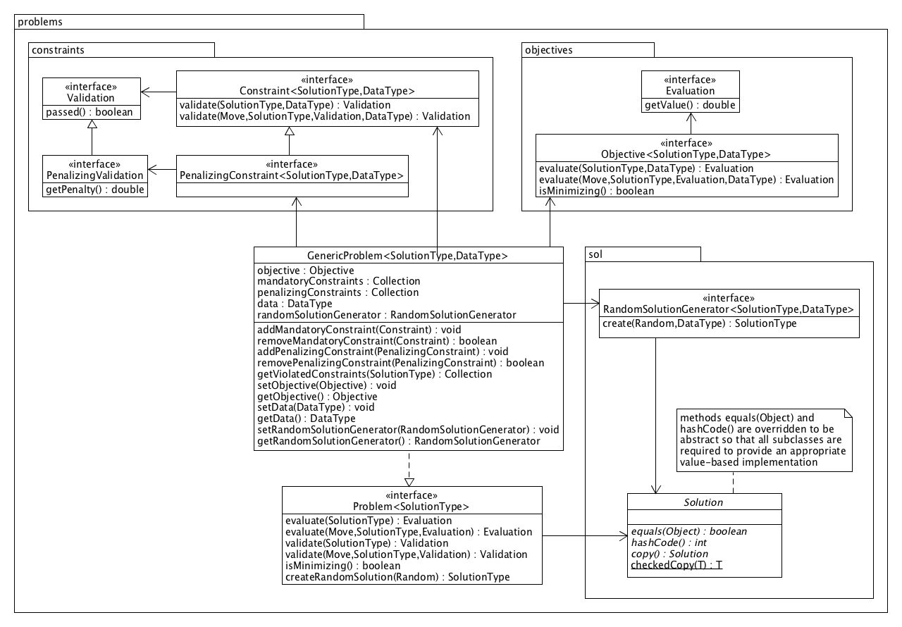 The key components of the problems package are shown in the diagram below: the top-level Problem interface, the GenericProblem implementation and interfaces of objectives/constraints, together with the produced evaluations/validations, and of a random solution generator. The data type of a GenericProblem is very problem specific and therefore not confined in any way. A custom class can be used to model the data in combination with objectives and constraints that require this type of data. The solution type of a Problem is required to extend the abstract Solution class.