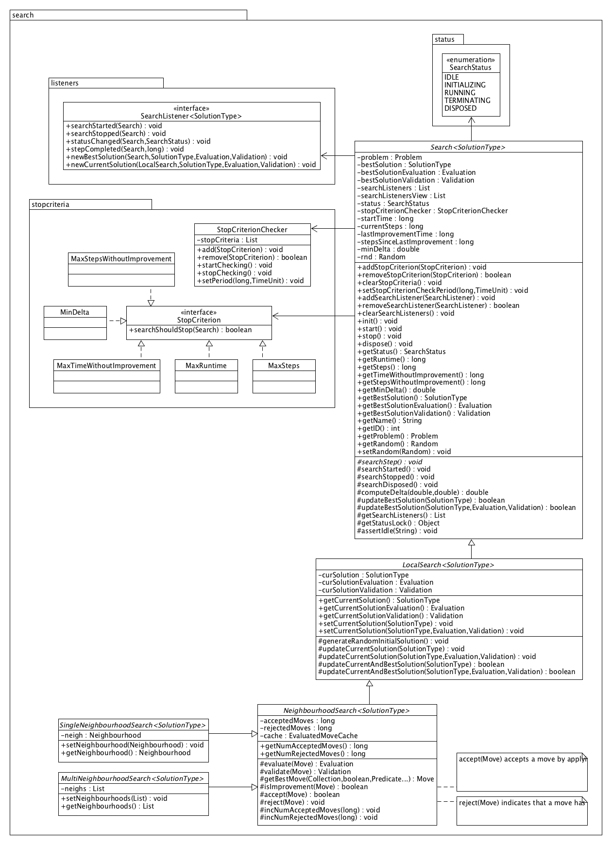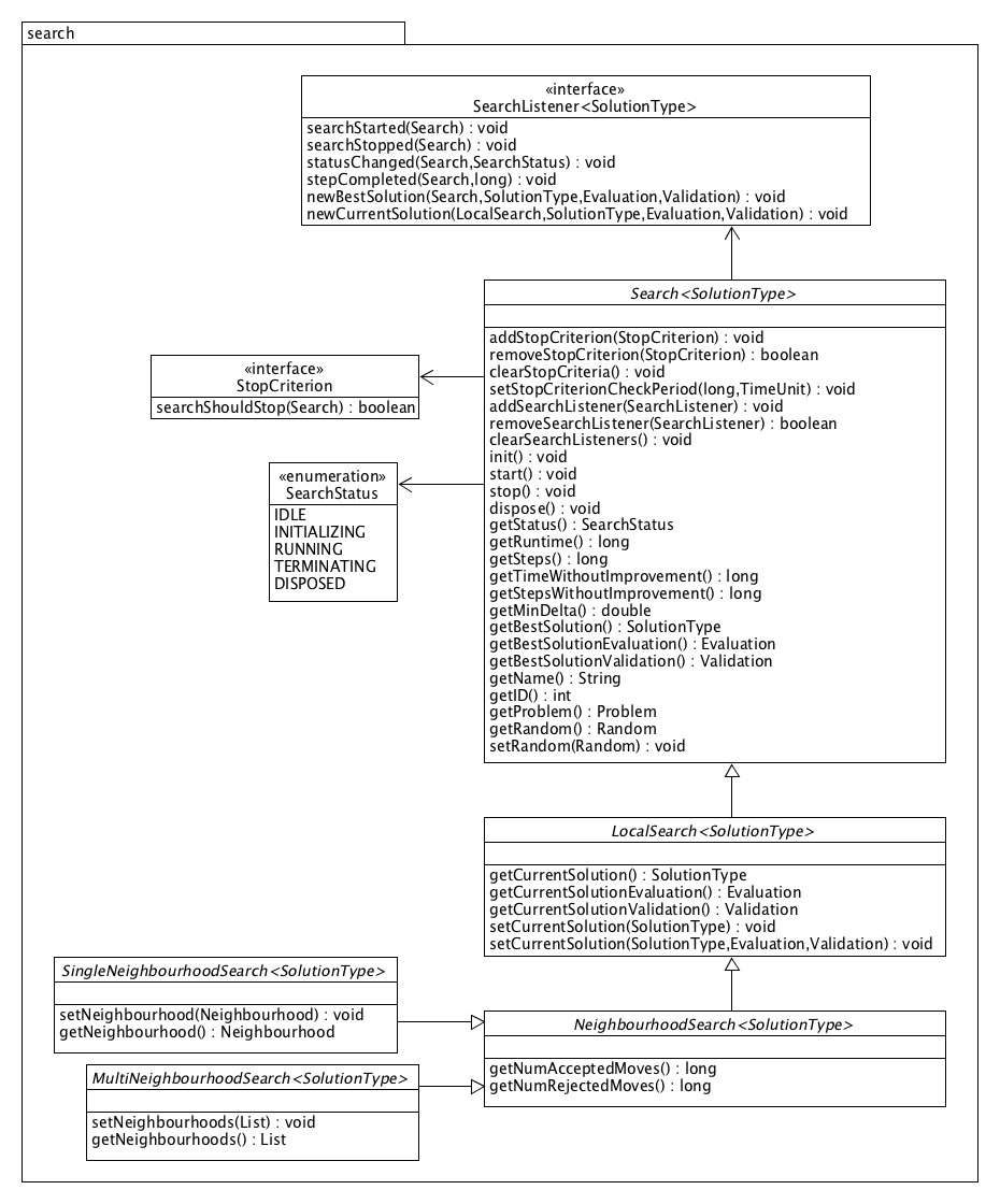 The main search related components are displayed in the diagram below. It shows all public methods of the top-level Search class and the more specific LocalSearch and NeighbourhoodSearch subclasses. These include general methods to start and stop the search, to attach search listeners or stop criteria, to get the best solution found so far and to access metadata such as the current runtime.