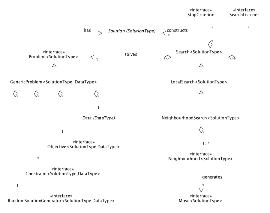A local search also has methods to set and access the current solution. If the current solution is not set before starting the search, a random initial solution will be generated by most local searches (when calling init() or start()). A neighbourhood search adds methods to access metadata on the number of accepted and rejected moves, which have been generated by the neighbourhood(s) in an attempt to improve the current solution.