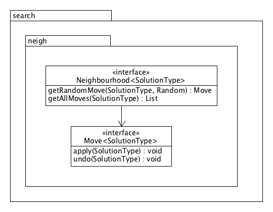 A neighbourhood search uses one or more neighbourhoods to generate moves that are applied to the current solution in an attempt to improve it. Such neighbourhoods are defined by the Neighbourhood interface. They are capable of generating a random move or a set of all possible moves that modify a given solution into a similar, neighbouring solution. A Move can be applied to a solution to transform it into the corresponding neighbour and can also be undone to go back to the current solution.