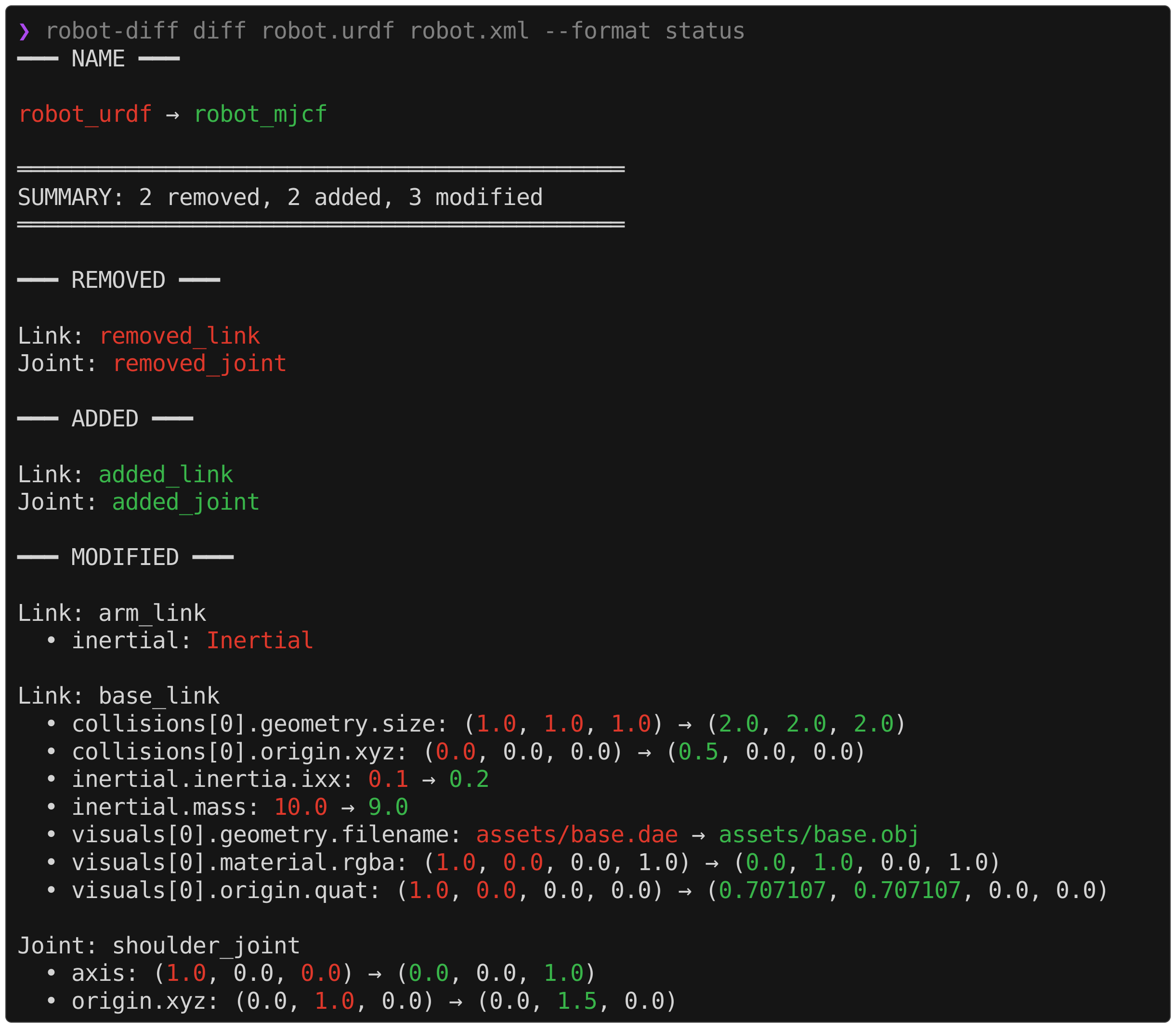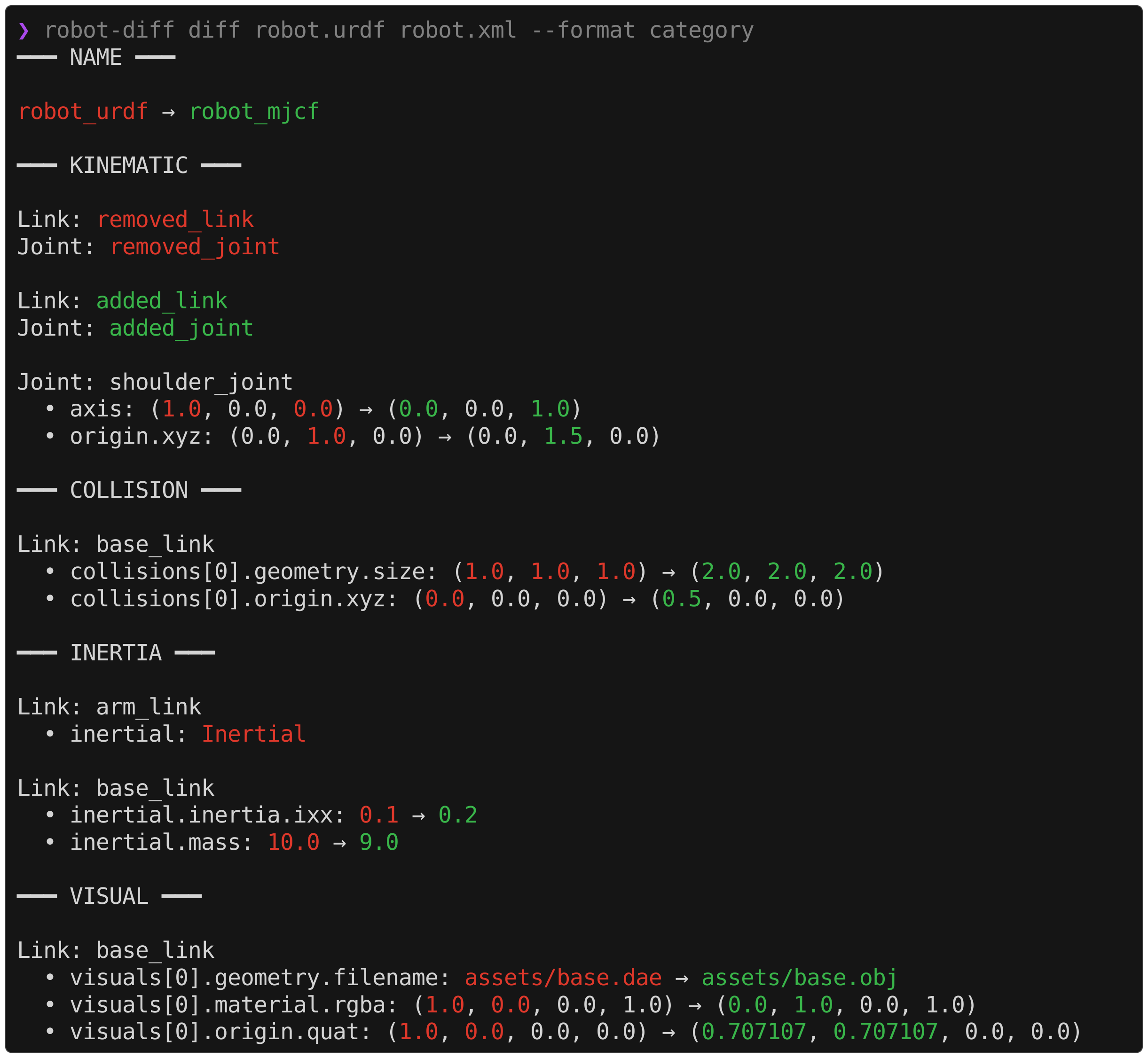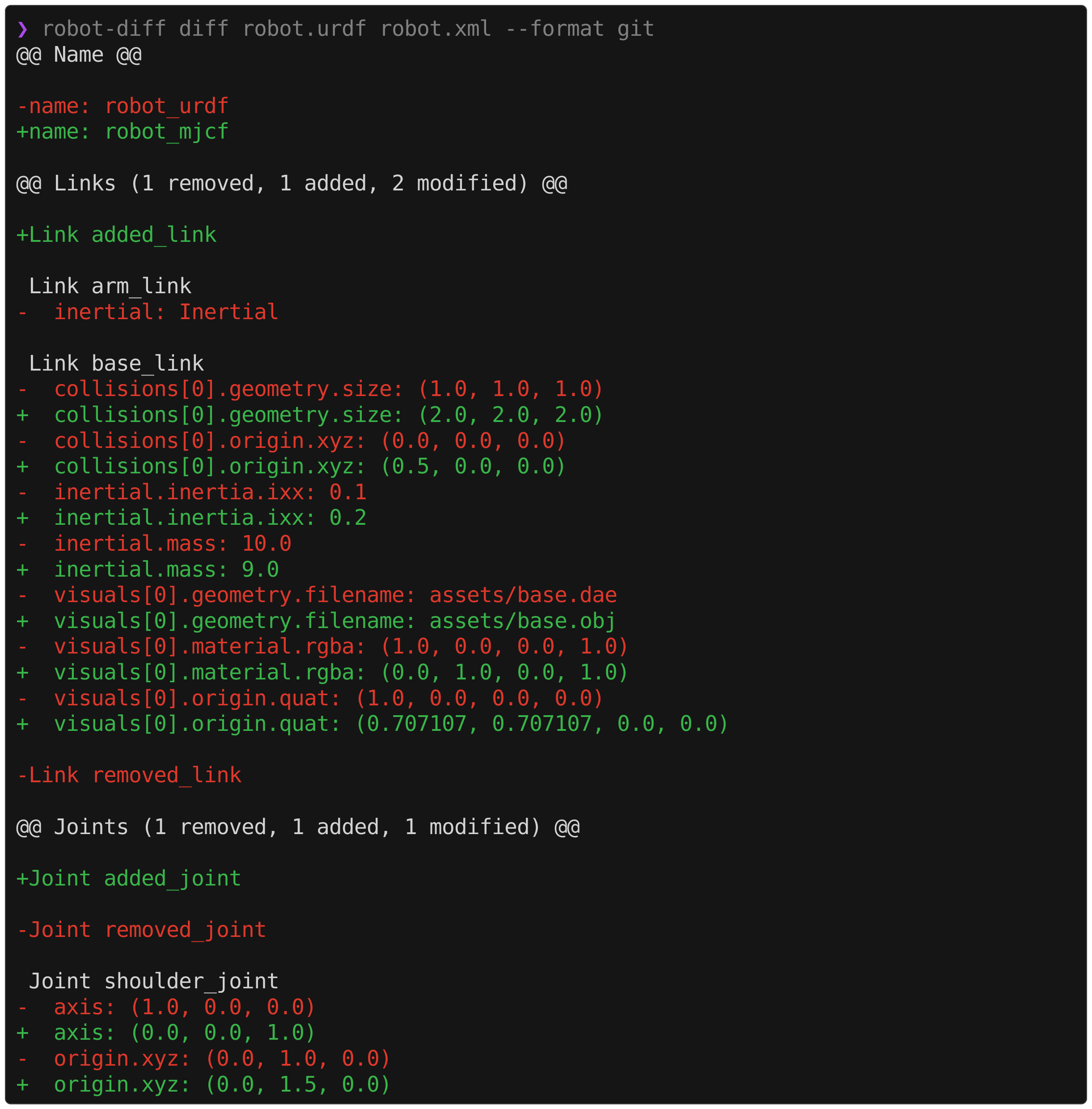 robot-diff diff robot.urdf robot.xml --exclude visual collisionIn the case where two robot models intentionally reference different visual meshes (e.g., .dae in URDF and .obj in MJCF), suppressing the visual diffs can help isolate the relevant information in the output.