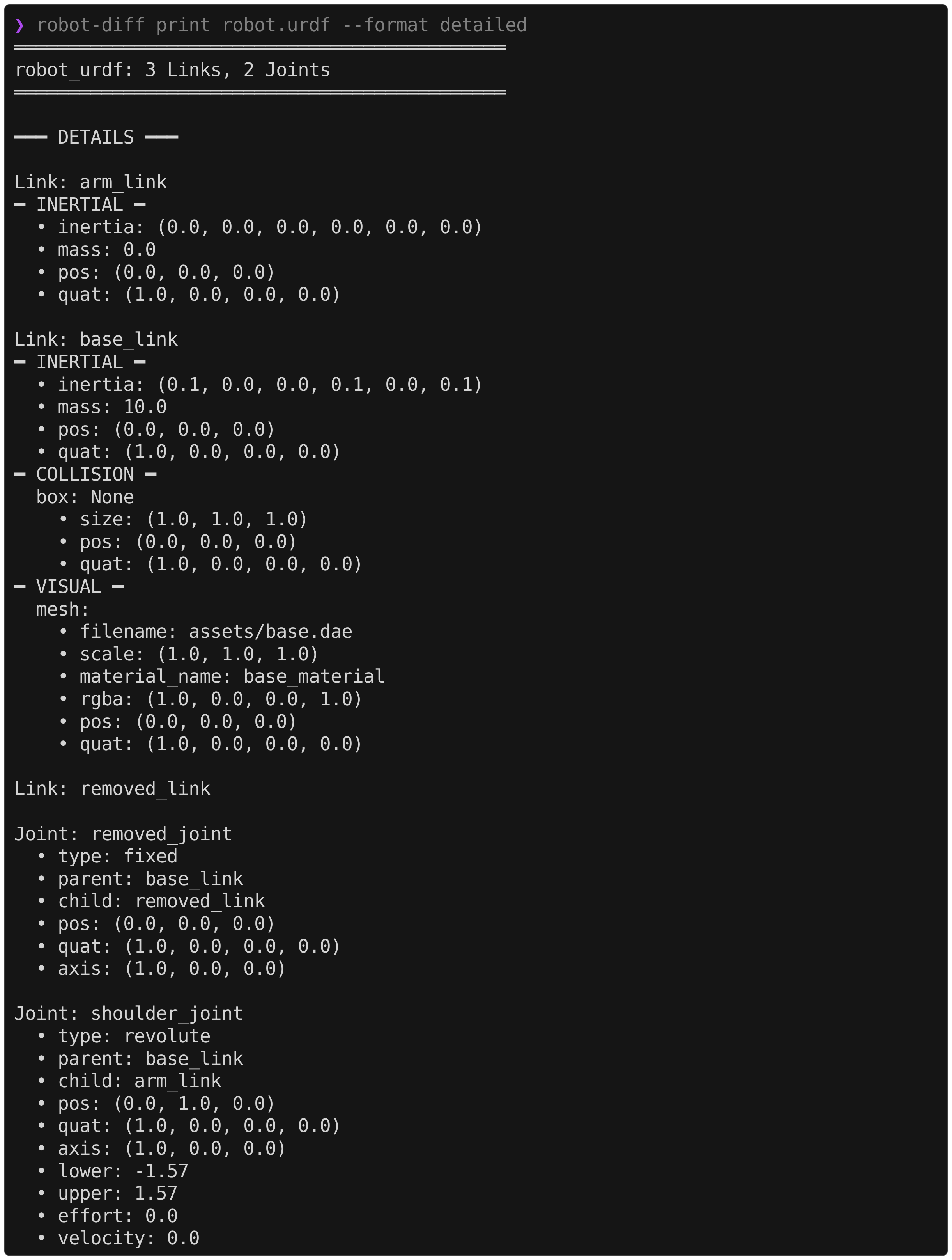 robot-diff print robot.urdfA single robot model file can be printed in two different formats. This can be useful for debugging which information was parsed into the internal Robot representation.