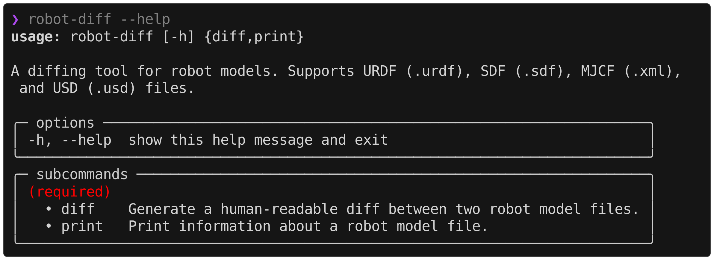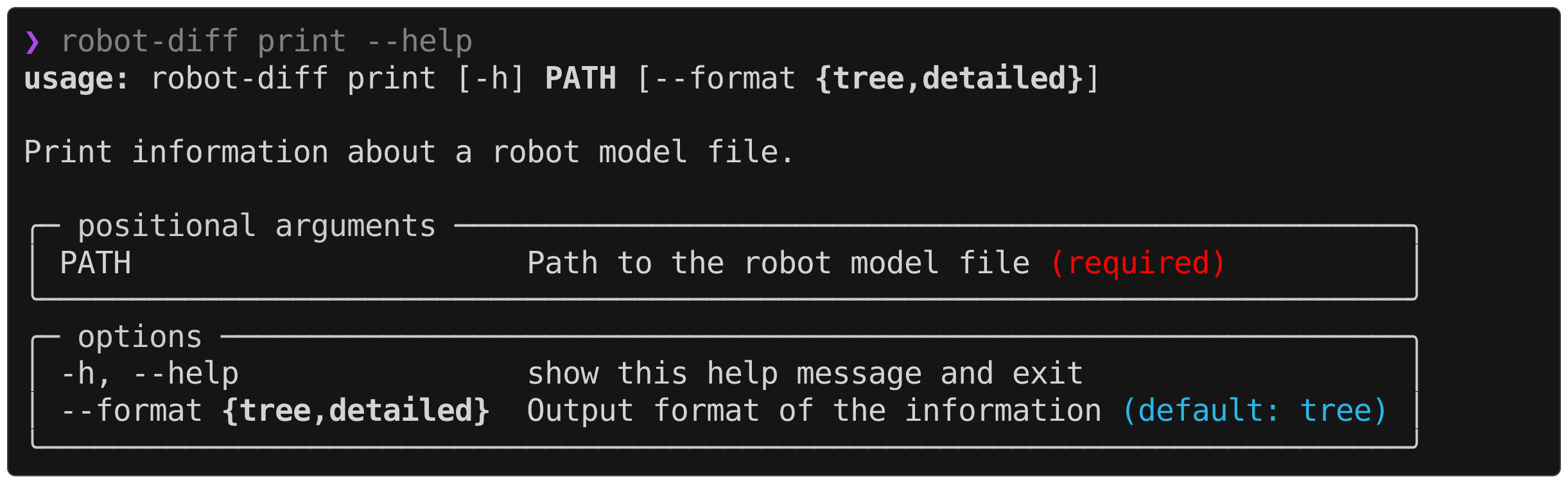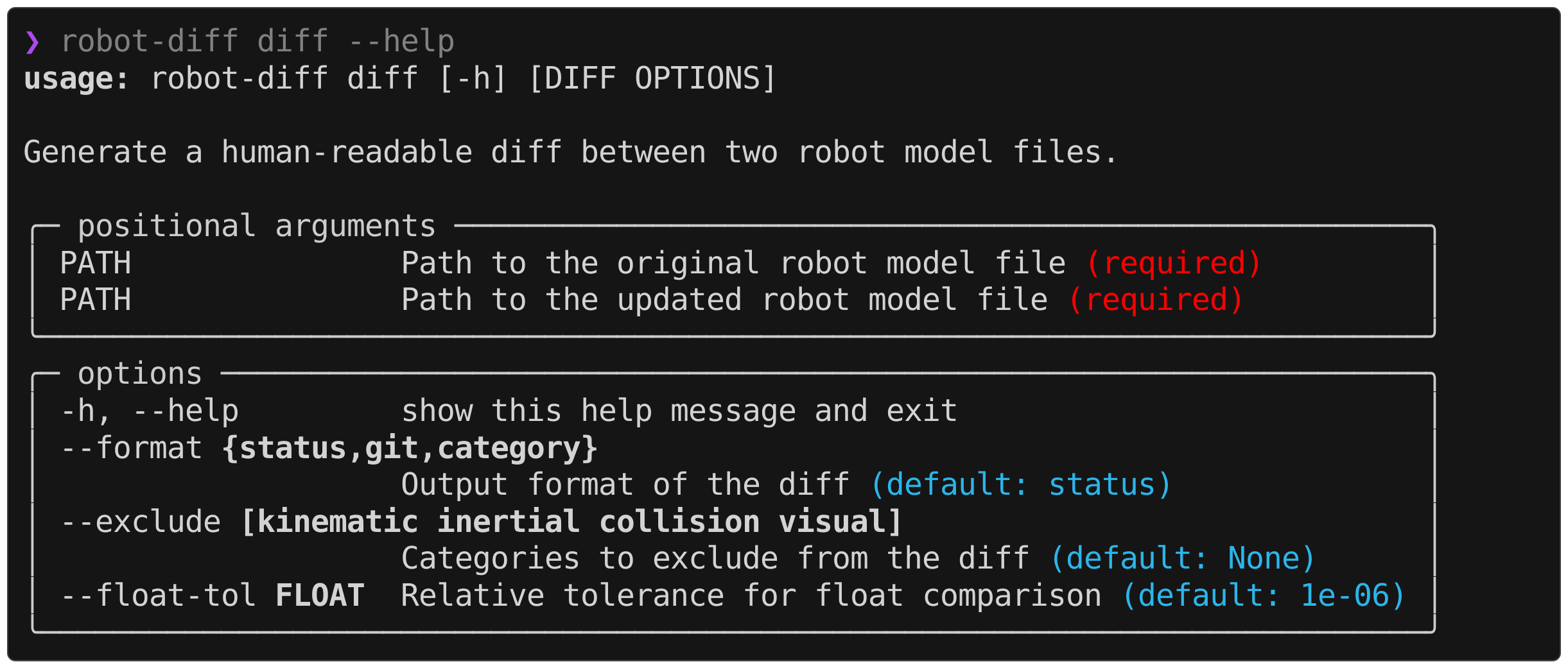 robot-diff supports three different formats out of the box and contains an extensible interface to define custom formatters. At runtime, the information about the diff between two robot models is parsed into a RobotDiff object, which can then be digested and printed by various formatters. The desired format can be specified in the CLI by,