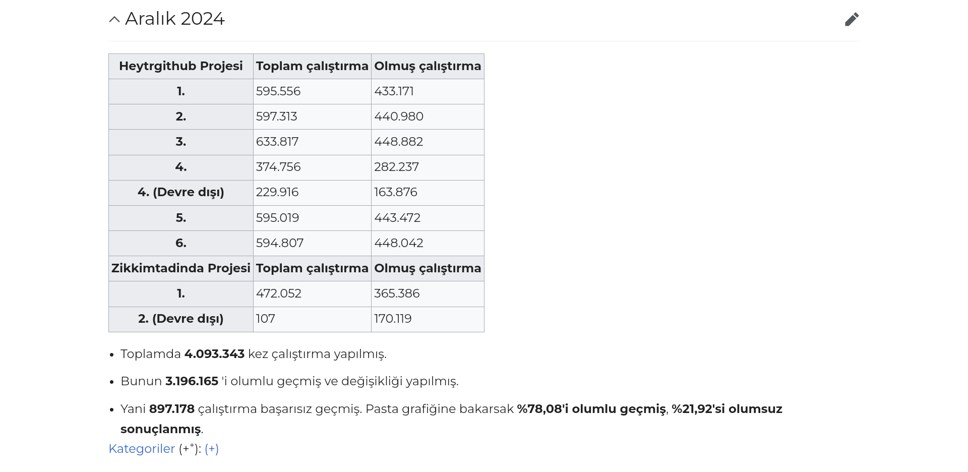 Son zamanlarda katkıların baya düştüğünün farkındayım. İstikrarlı bir şekilde 1 milyon değişikliği geçtik. Birkaç güne projelerin daha verimli çalışması için 2. versiyonunu geliştirip 1. versiyonlarını devre dışı bırakacağım. 4. proje artık Github actions üzerinden değişiklik yapmasından dolayı 4. projenin 1. versiyonunu devre dışı bıraktım.