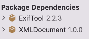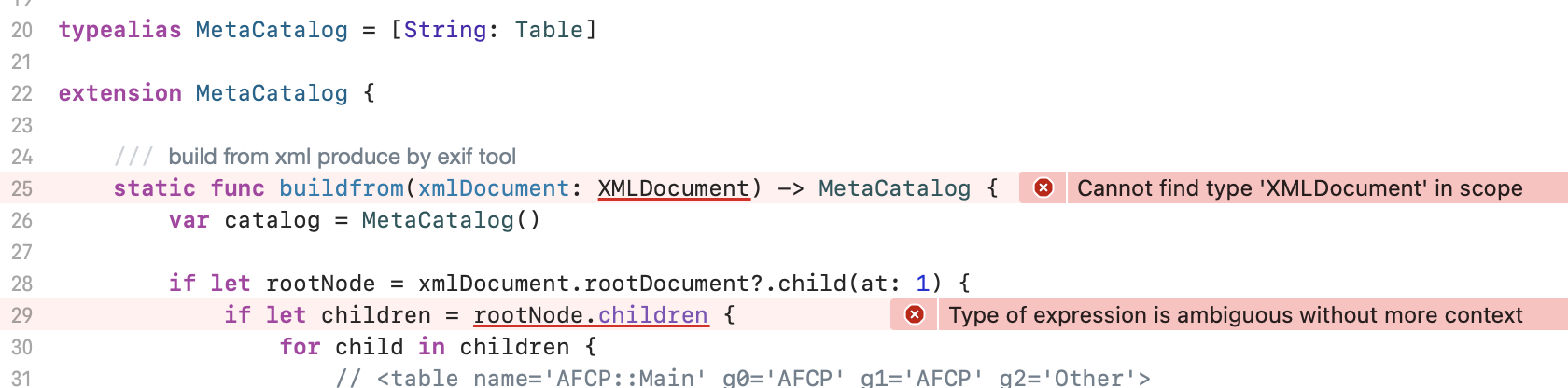 https://github.com/hlemai/ExifTool/blob/680249e4cd7f66c198af45509d27bdc897fd32b2/Sources/ExifTool/MetaCatalog.swift#L25 I'm seeing a compile issue, do you need to import XMLDocument? <img width="170" alt="image" src="https://user-images.githubusercontent.com/1576382/164119361-06882d1c-ffe9-4c20-8a48-b3ba0a567f8c.png"> <img width="840" alt="image" src="https://user-images.githubusercontent.com/1576382/164119373-fe86d3c3-ea23-48a8-93a8-850f2f1ee098.png"> <img width="330" alt="image" src="https://user-images.githubusercontent.com/1576382/164119460-42a68011-c11f-45c0-b281-6b8201093fa2.png">