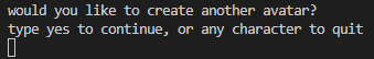 the program will ask if you'd like to create another avatar or not, where you can continue playing or quit: