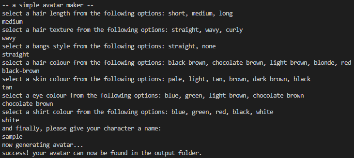 after completing all the questions, the program will build your avatar: