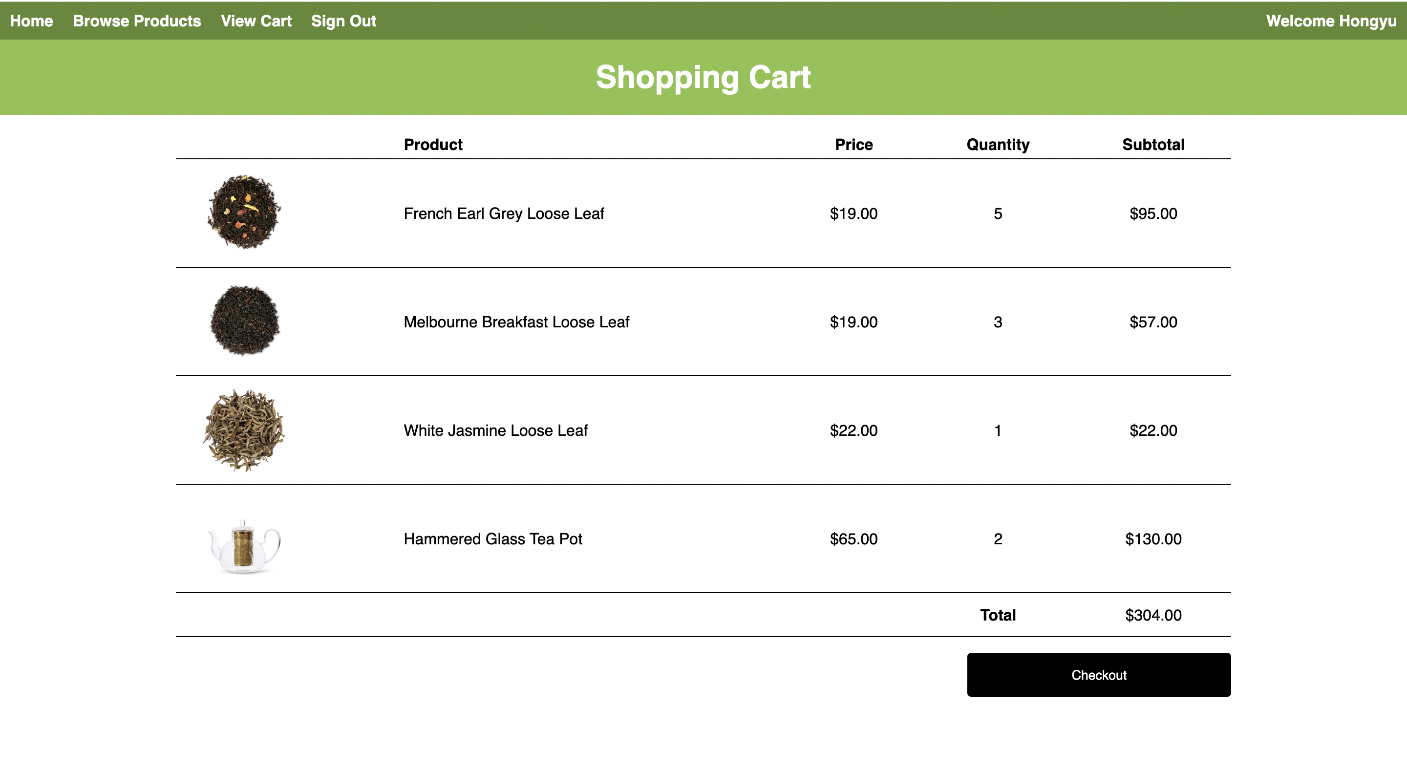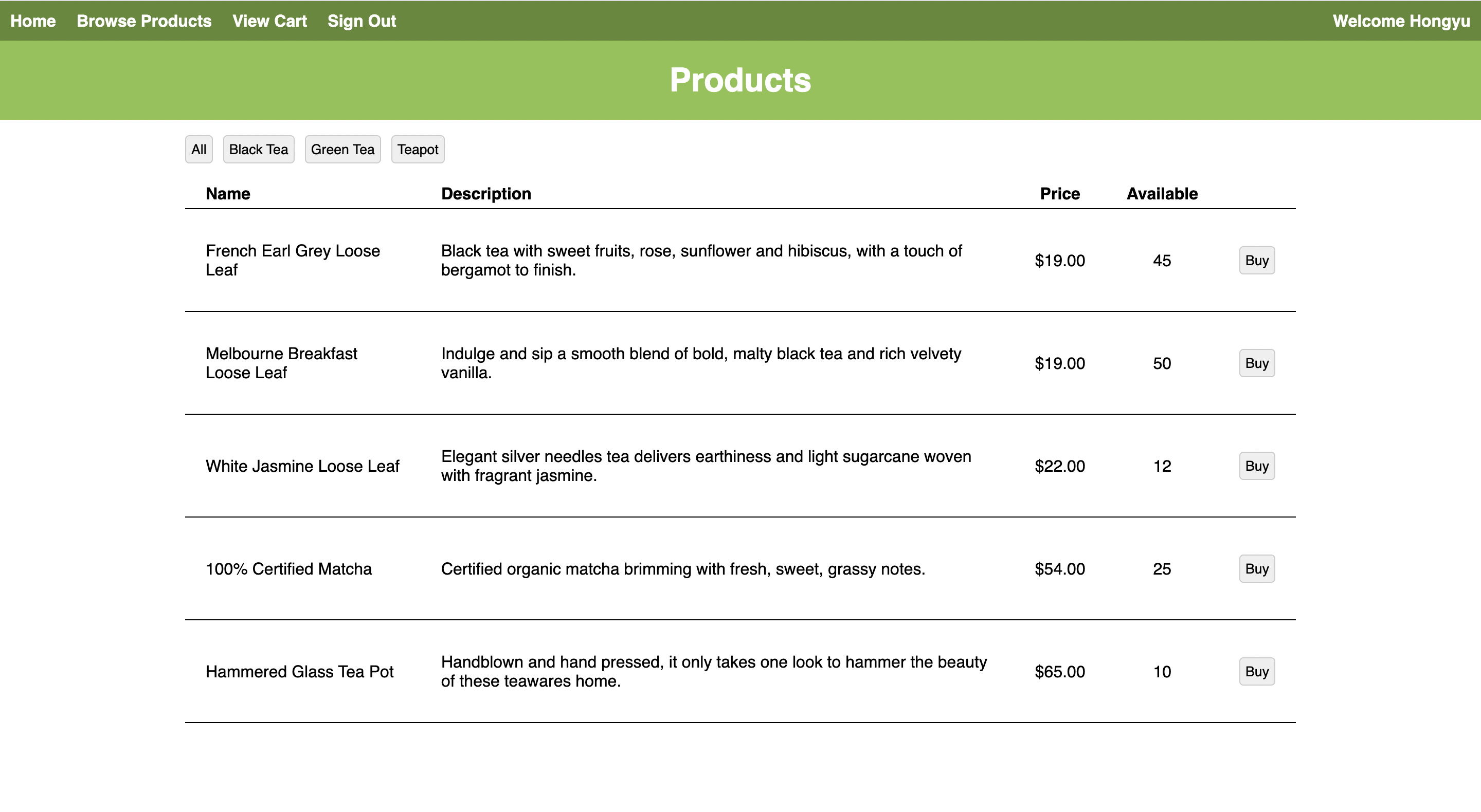 The objective of the project was to create a client-side rendered web based online shopping application that allows registered customers to purchase products. This web application is an iteration of the https://github.com/hongyuhuang/Tea-Time-Server-Side.