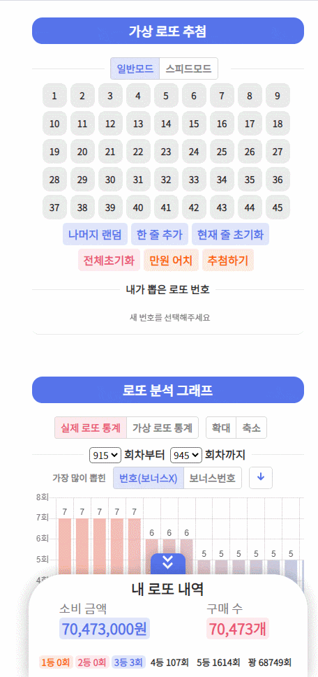 • 특정회차 구간의 통계 및 유저 가상 로또 통계 차트 제공 (주기적 데이터 페칭)