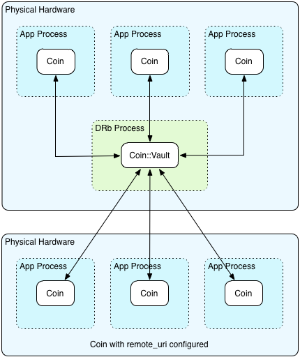 Coin.length # => 0Coin automatically starts a DRb server that hosts the Coin::Vault. You can take control of this behavior if needed.