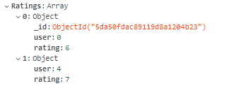mutation{ updateRatings(ID:1, input: {user: 0, rating: 5}){ NameMobileWeb Ratings{user, rating} ID } }Args: