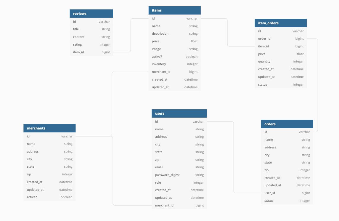 Monster Shop is made up of merchants and items. Merchants have many items, and items belong to merchants. Items can be ordered and reviewed by users. CRUD functionality for merchants, items, and orders is determined by user role: visitor, regular user, merchant employee, and administrator.