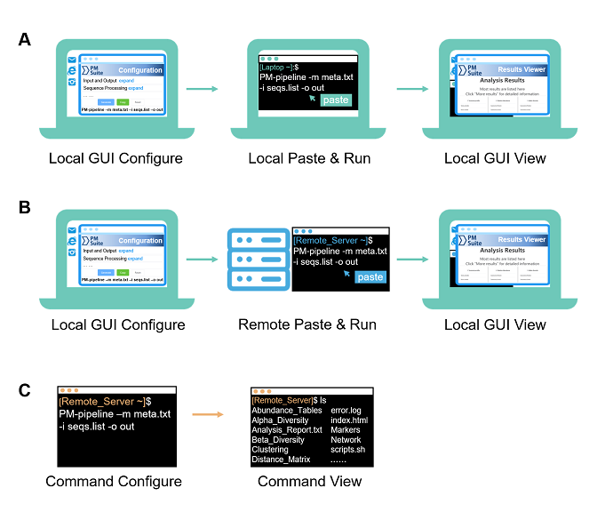 Fig. 1. Three typical usages of PMS for different scenarios and platforms. (A) Local GUI configure and run. (B) Local GUI configure and remote run. (C) Command configure and run (for both locally and remotely).