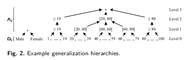 Q: not clear "and refer to such datasets as microdata"??? 2.2 Transformation Models: Data anonymization is typically performed by reducing the distinguishability of records. Common methods: The paper focuses on attribute generalization through user-specified hierarchies, which describe rules for replacing values with more general but semantically consistent values on increasing levels of generalization.
