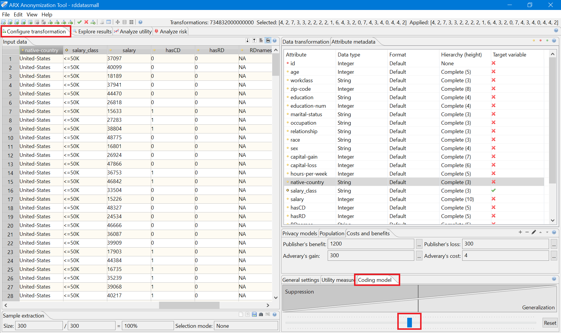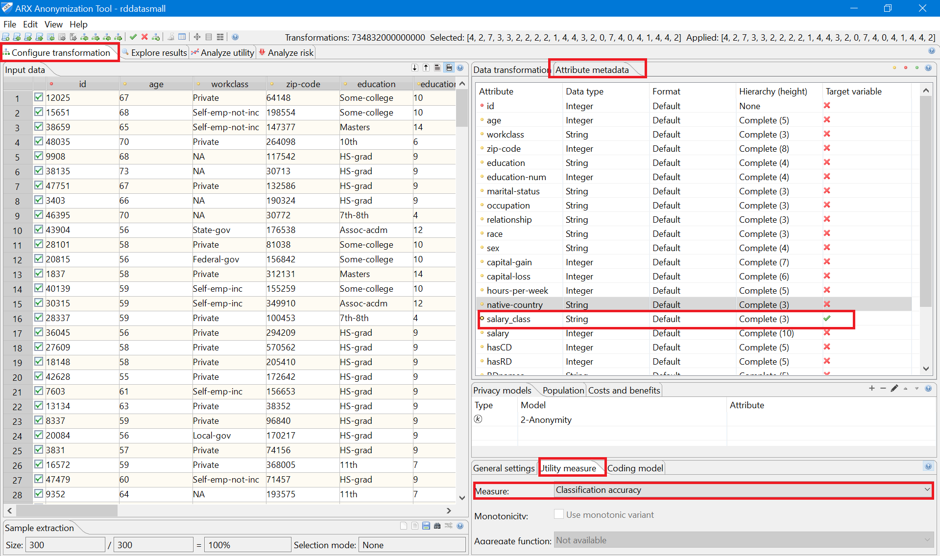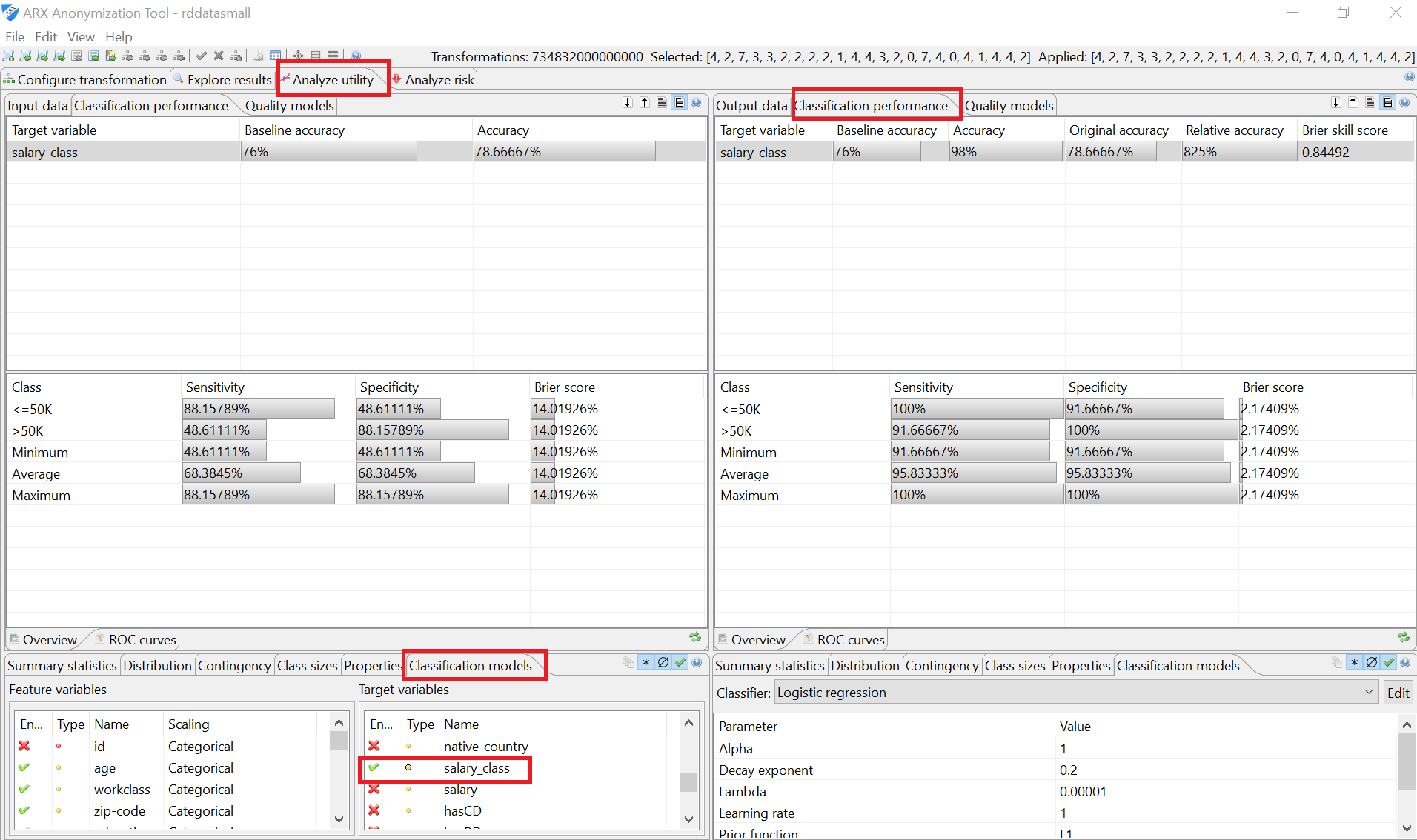 To evaluate the anonymized data using classification, select Analyze utility, Classification performance, Classification model then select one or more Target variables: