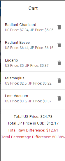 We have incorporated a cart feature that allows users to compare the total price of their selected cards in both US dollars and Japanese yen. This feature allows users to make informed decisions about their purchases by offering a clear and straightforward way to assess potential cost savings or earnings.This includes not only the sorted list of cards but also visual indicators such as color-coded price differences and arrows indicating price trends.