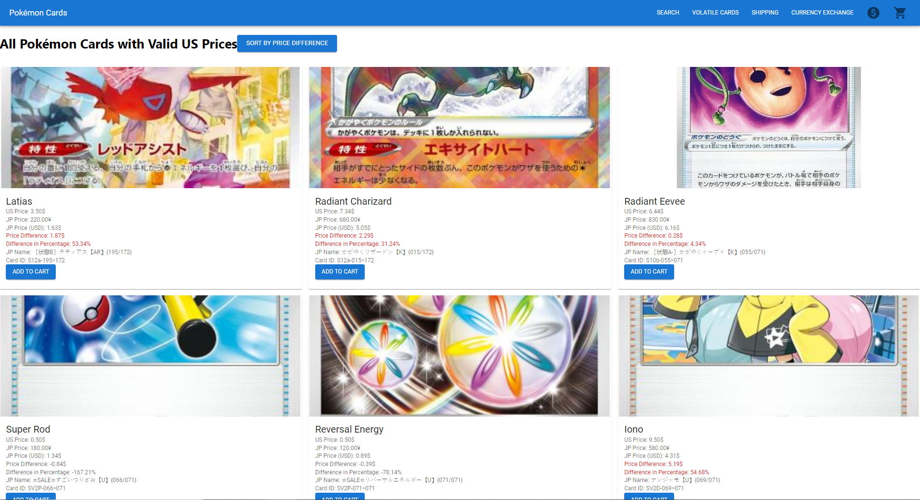 This repository contains a Pokemon application designed to track and compare the price differences between the Japan and US markets for Pokemon cards. This tool is especially useful for collectors and resellers looking to take advantage of price discrepancies across markets.