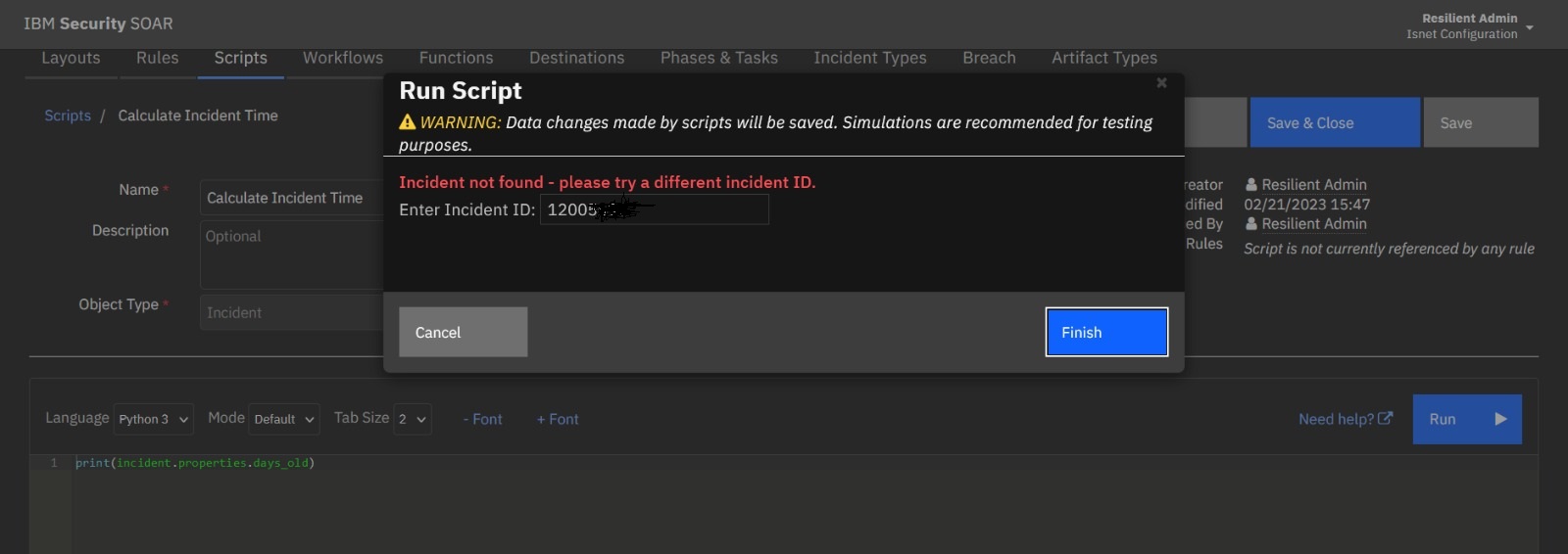 I'm trying to test script, but resilient unable to find the incident. I have tried both sim and real incident id.