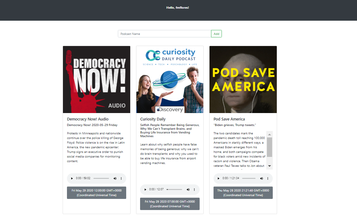 Once you are logged in, the app will display your GitHub username in the navbar, confirmation, if you will, that you are logged in. You will now be able to personalize your account by using the search bar and the "Add" button to search and add your preferred podcasts. We used the iTunes API to search for podcasts. The podcasts you add will populate the screen below. You will be able to get a summary of the podcast as well as listen to your chosen podcast.