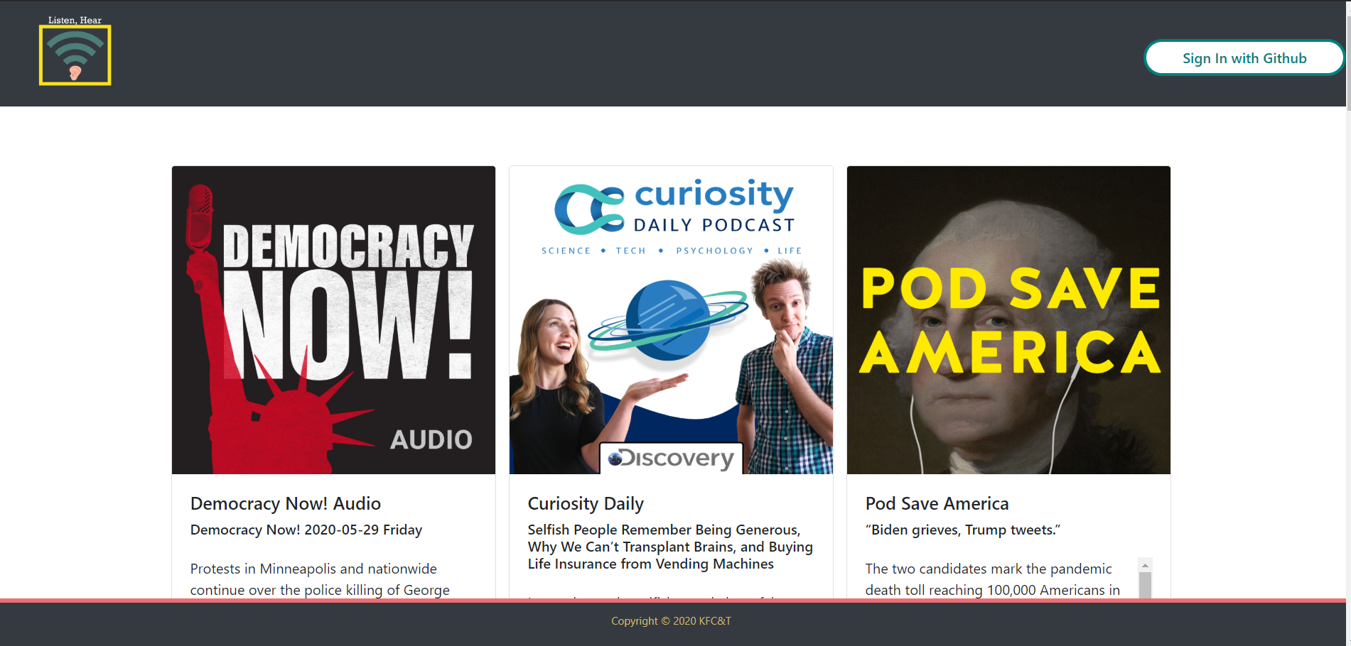 Listen, Hear is the only app you will ever use to track and playback your favorite podcasts once you subscribe! Using Listen, Hear by visiting https://fsf-p02.herokuapp.com/, you can: