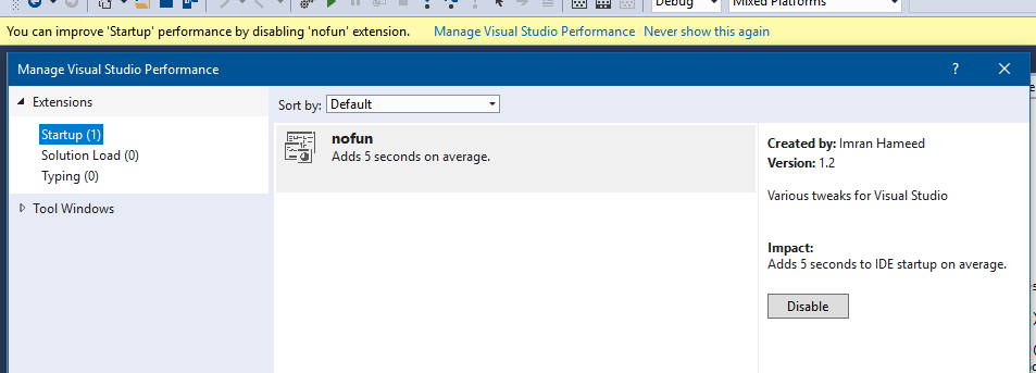 Visual Studio 2017 is reporting 'nofun' as slowing startup ("Adds 5 seconds on average.") I tried enabling/disabling the different settings available in nofun without any apparent change. I've see this issue even after OS and VS2017 reinstall.