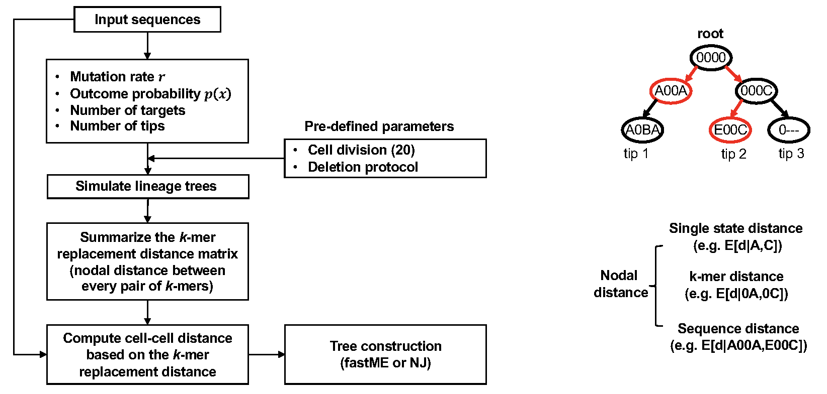 DCLEAR also implements a k-mer replacement distance (KRD), which does not require training data. KRD method first looks at mutations in the character arrays to estimate the parameters of the generative process associated with the tree to be reconstructed. With these parameters, we repetitively simulated trees with a size and mutation distribution similar to the target tree. The k-mer replacement distances were estimated from the simulated lineage trees and used to compute the distances between input sequences in the character arrays of internal nodes and tips. Specifically, by examining the simulated lineage trees, KRD estimated the expected 1-mer replacement distance between characters in the array (including ground state “0” and deletion state “-“) in the lineage trees and the probability for a given nodal distance of replacing a character in a cell array. To extend the 1-mer replacement distance to the k-mer replacement distance, the posterior probability distributions of k-mer replacement distance were estimated by using a conditional model considering a dependance for the concurrence of mutations. We found that by considering the neighboring characters, the conditional model can more accurately estimate the nodal distance than an independent model. The cell distance can then be readily computed as the mean expected k-mer replacement distance.With the previously proposed distance matric, we can construct distance matrix among cells. We can apply tree construction algorithms such as Neighbor-Joining(NJ), FastME.