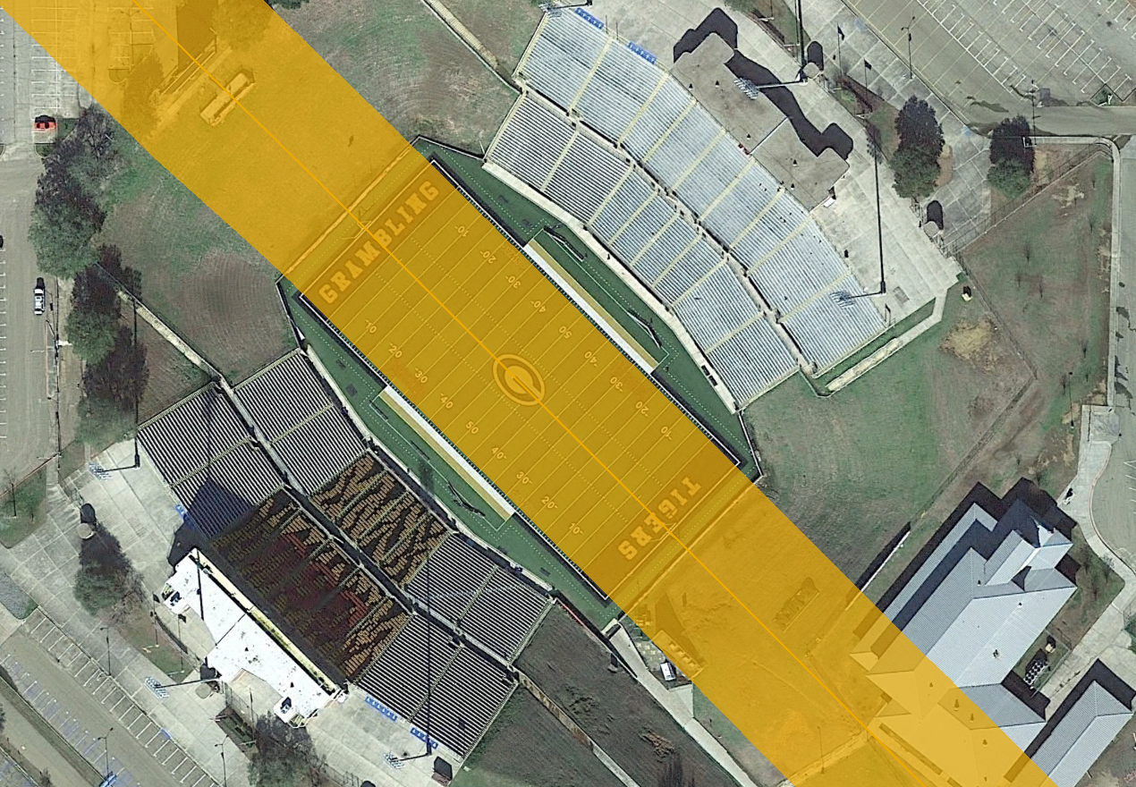 Purdue's field is the next candidate that meets the above, but doesn't appear to be affected severely enough (although the field markings aren't great in the default terrain/buildings view, so it's hard to tell for sure).