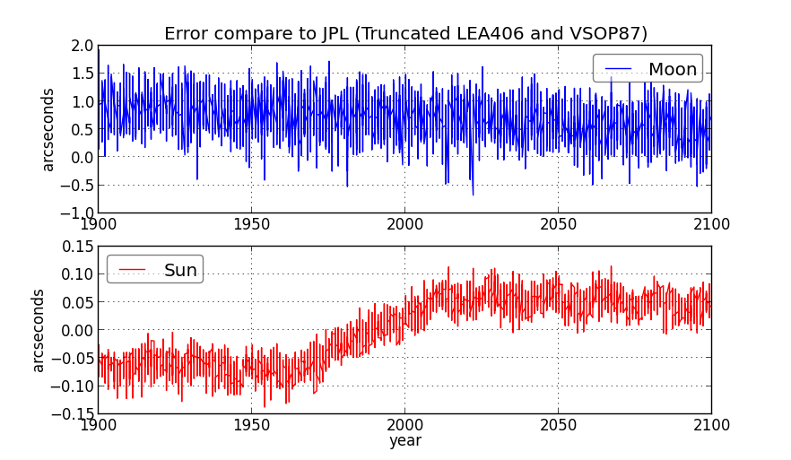 The full version of LEA-406 and VSOP87 are used by default. A truncated version , aa.py, which is slightly faster, is also included. The accuracy of this implementation, when compare to the apparent Sun and Moon longitude finded by the DE431 based JPL Horizon, are showed in following figures: