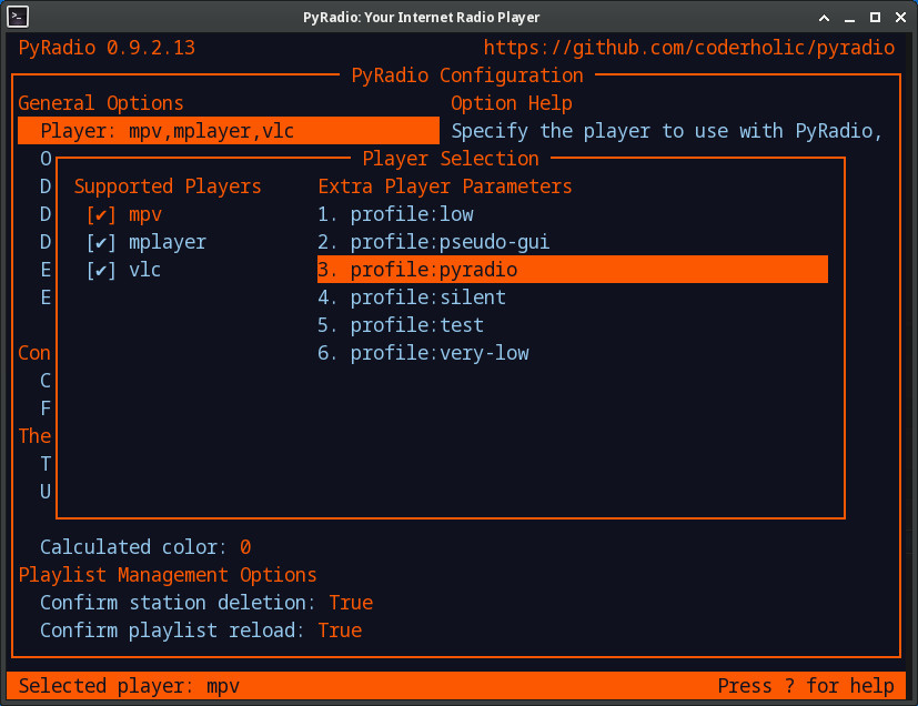 Usage: pyradio [-h] [-c CONFIG_DIR] [-s STATIONS] [-p [PLAY]] [-u USE_PLAYER]