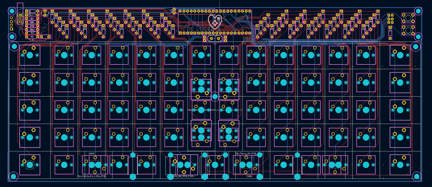 This is a 69 key (nice) keyboard assembled with only through hole components, including usb type-c.