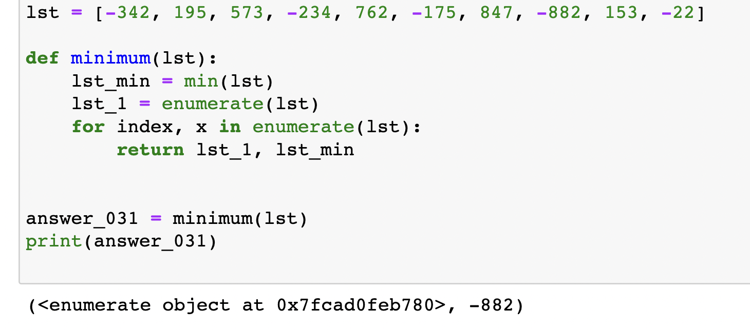 Hi, I have tried to get the minimum value and the index for the list, but the output only show the minimum value and what i guess is an error code for the index. I have tried to find a solution on google, but i can't get the right output. Can you help ?
