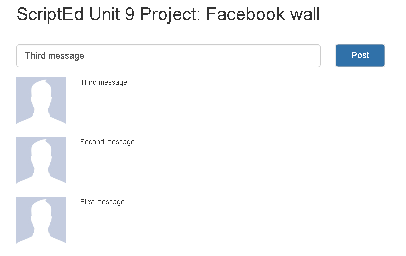 This project involves creating a simple Facebook-like wall. The objective of this project is for students to practice their jQuery skills. Unlike previous projects, students are presented with minimal scaffolding.
