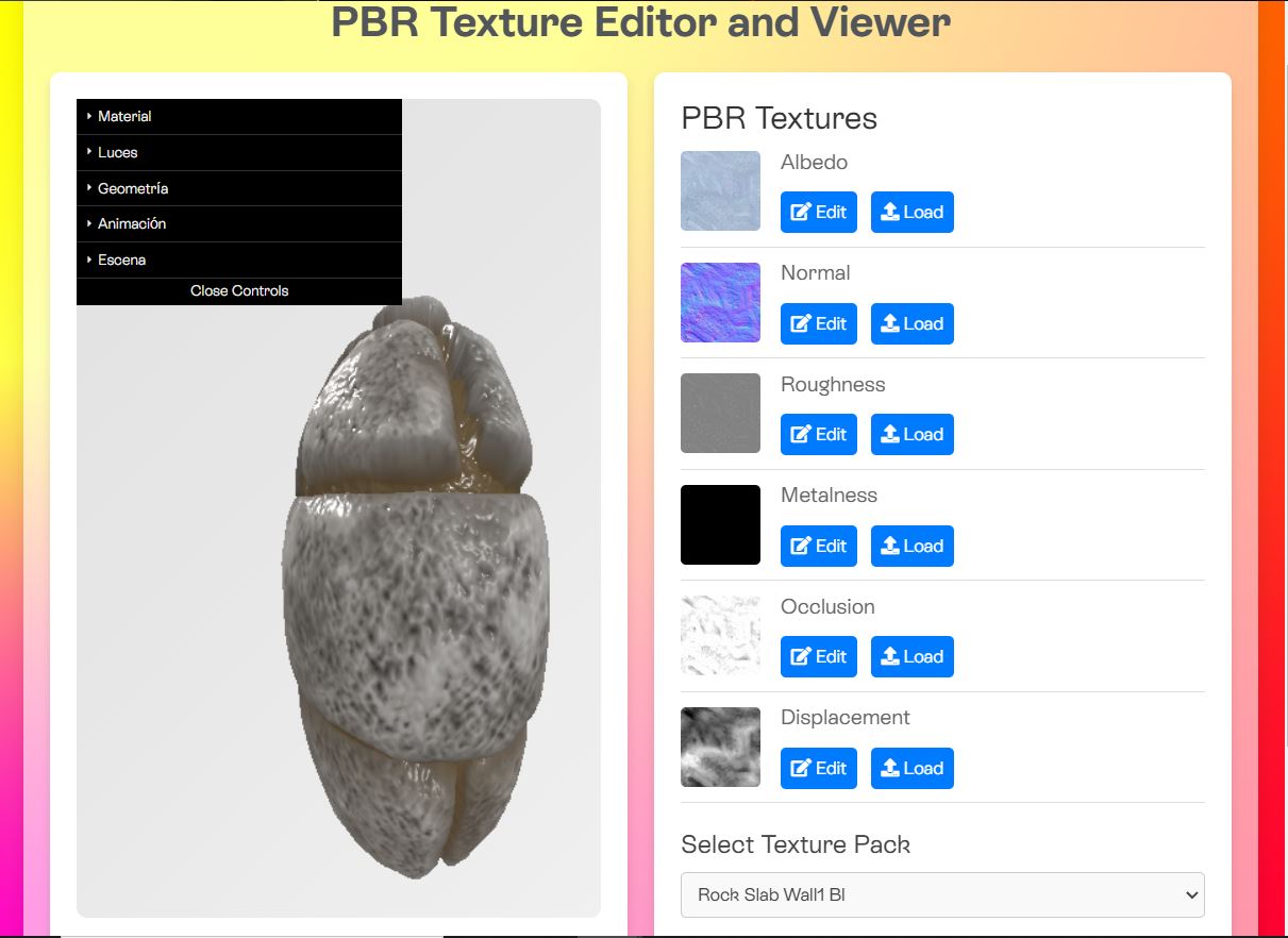 PBR Texture Editor and Viewer is a web application that enables users to edit and visualize Physically-Based Rendering (PBR) textures in real-time on a 3D model. This tool is designed to streamline the process of reviewing and adjusting textures without the need for complex 3D software like Blender.