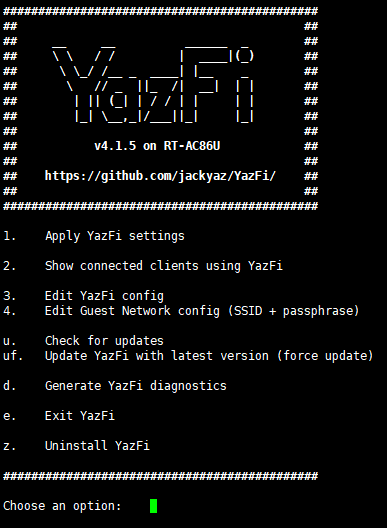 /usr/sbin/curl -fsL --retry 3 "https://jackyaz.io/YazFi/master/install/YazFi.sh" -o /jffs/scripts/YazFi && chmod 0755 /jffs/scripts/YazFi && /jffs/scripts/YazFi installPlease then follow instructions shown on-screen. An explanation of the settings is provided in the FAQs