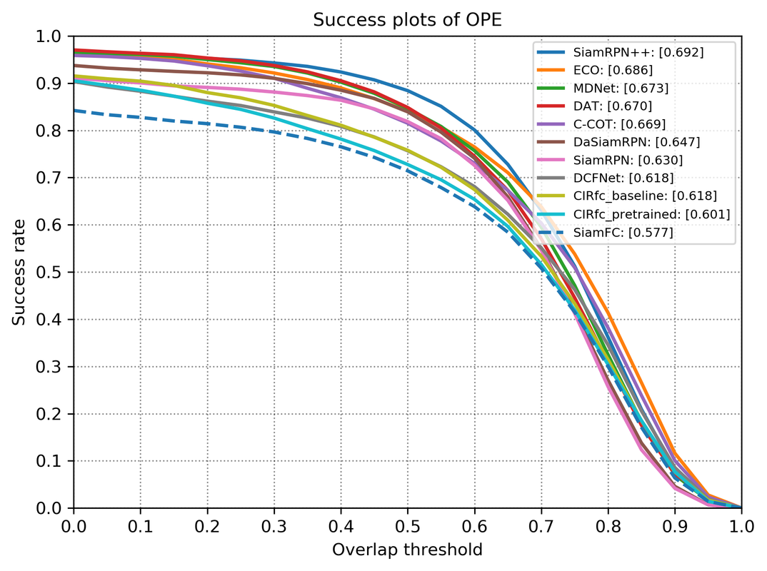 NOTE: The author proposed CIR/CIR-D unit into both SiamFC and SiamRPN, repectively denoted as SiamFC+ and SiamRPN+. Currently this repo only contained that of SiamFC+ and SiamRPN+ with backbone ResNet22 and others will be listed into future work.