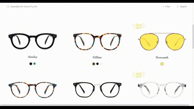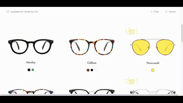 Step-by-step: Guided question that narrow down to 5 pairs. Try on at home: Automatically adds 5 samples to cart.