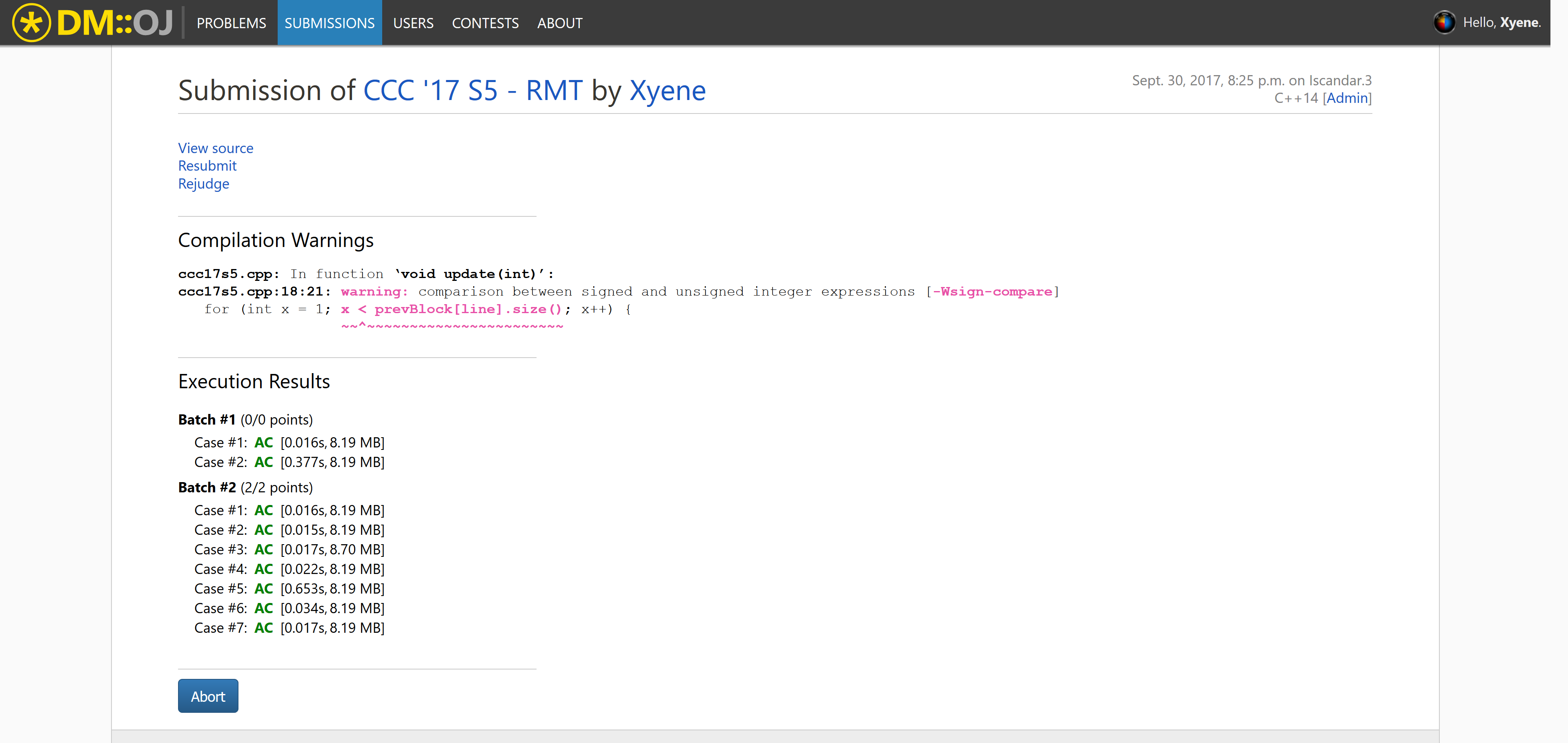 Submission pages feature live updates, and submissions may be aborted by both submission authors and administrators. Compilation errors and warnings for a number of languages feature color highlighting.