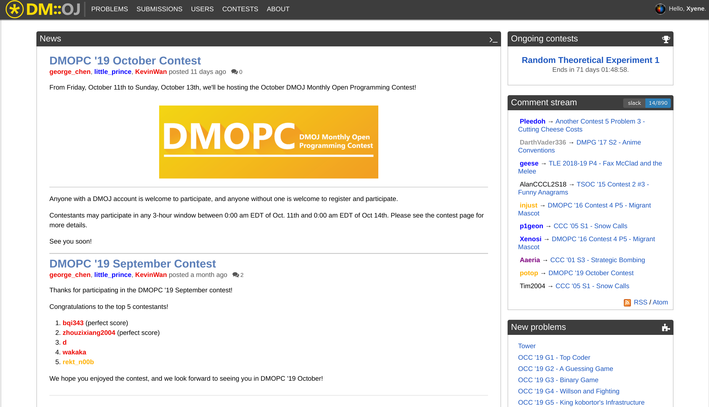 Announcements from administrators, ongoing contests, recent comments and new problems are easily accessible from the home page.