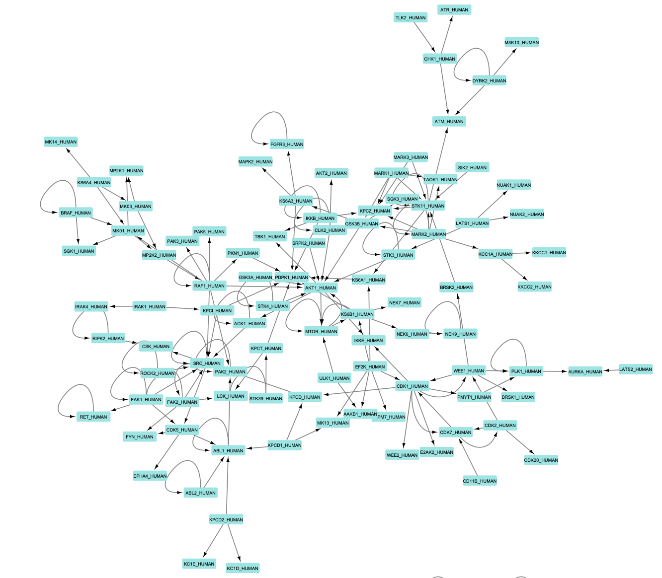 Signalling networks are formed as a result of interacting cell signalling pathways. One important example of a cell signalling network is that formed by kinase proteins. These enzymes interact with other kinases or with themselves by phosphorylating hydroxyl groups of some residues. Given that there are approximately 518 human kinases, by controlling the activity and function of various proteins, they play a key role in the regulation of overall cellular function. Therefore, disruption of kinase signalling networks affects the cell physiology and has been known to have implications in cancer and neurodegenerative diseases.