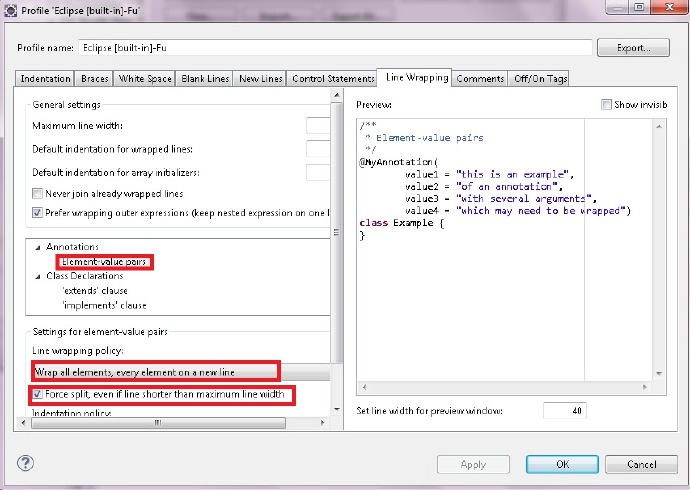 ->windows->preferences->java->code style->formmater ->Line Wrapping
